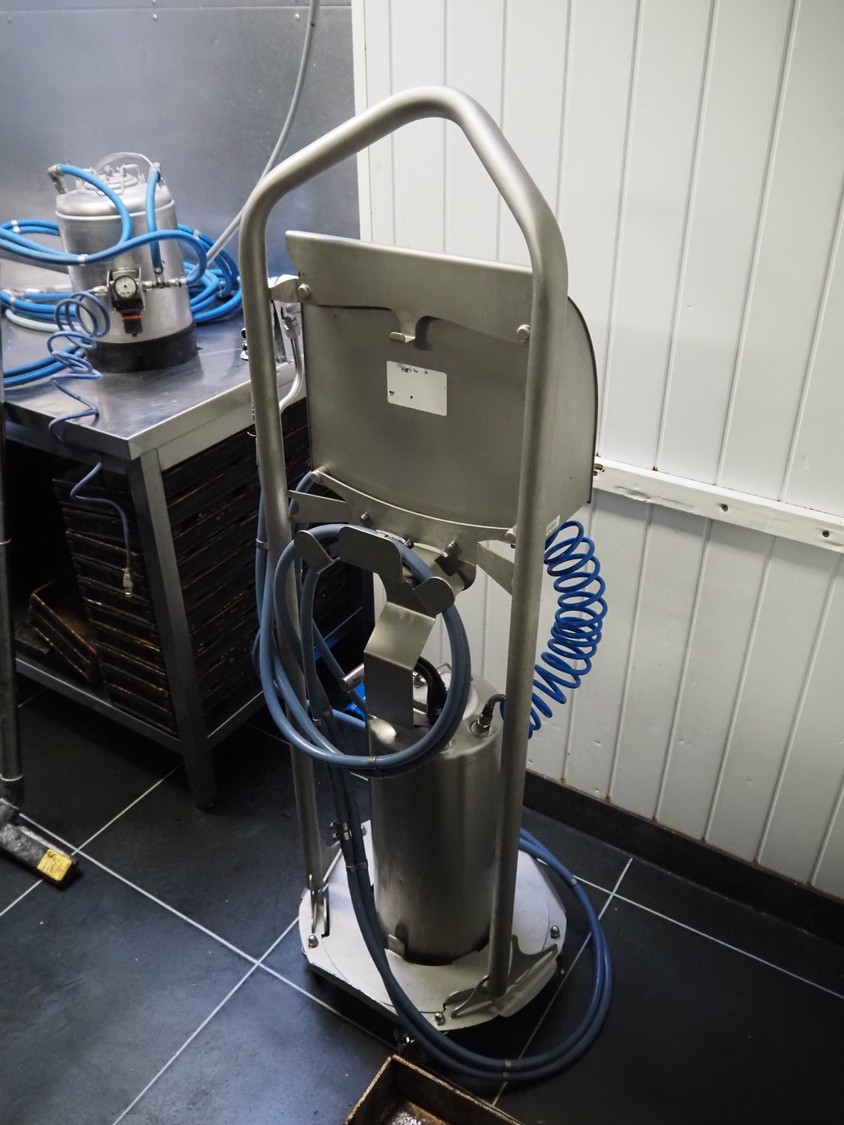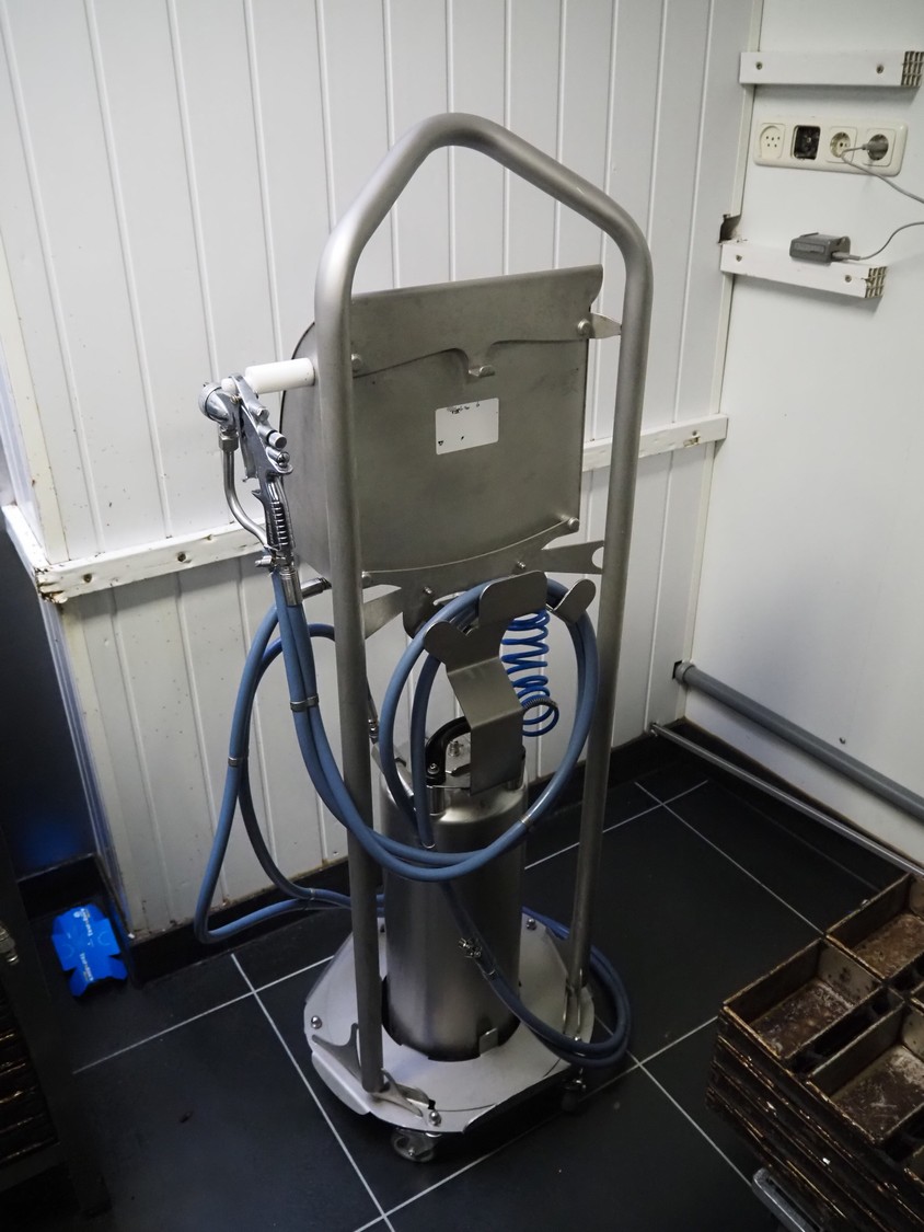 Dubör oil spraying machine, tank dimensions: Ø 200 mm x 550 mm, total dimensions: 470 mm x 570 mm x 1430 mm.