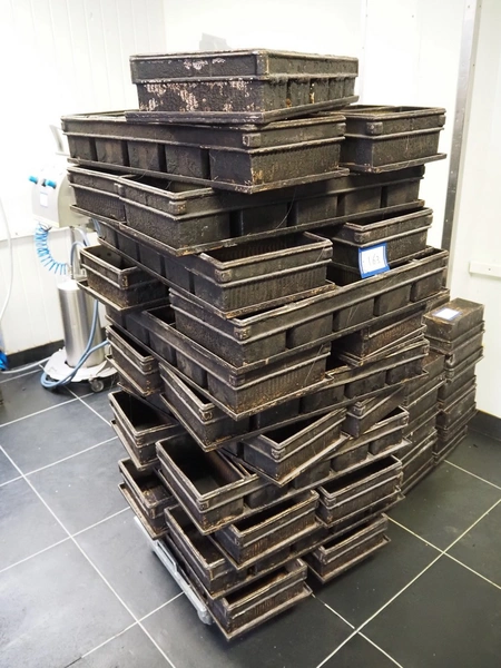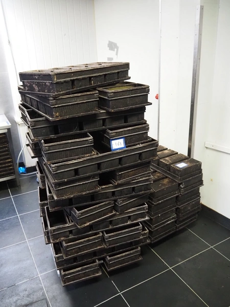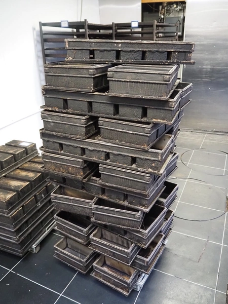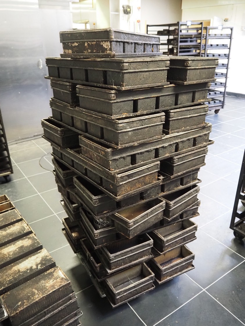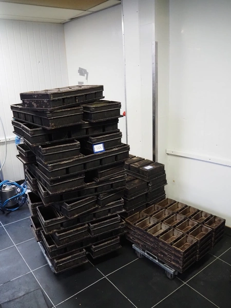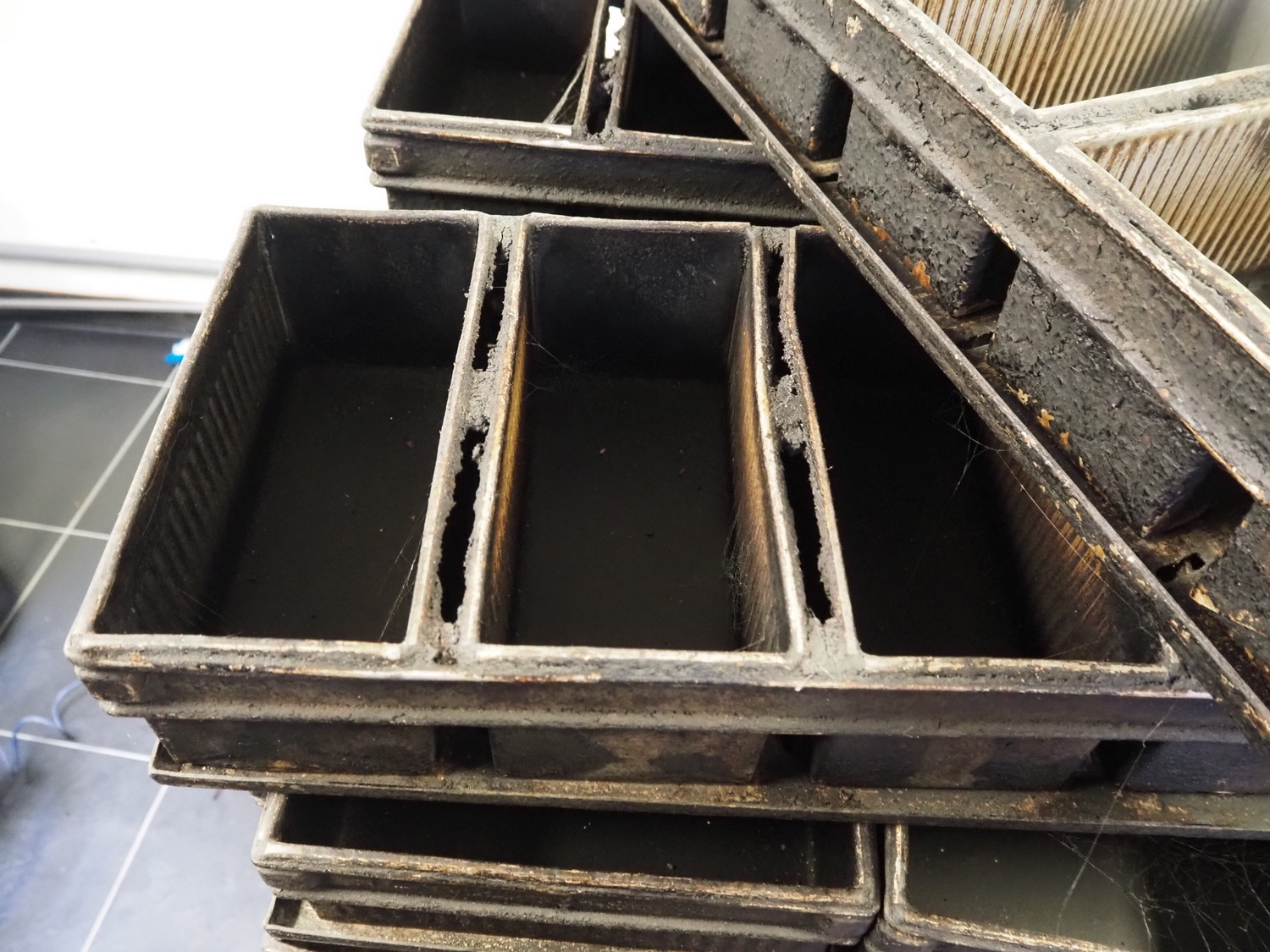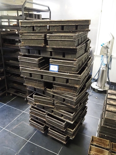 Large amount of baking forms, inside dimensions: (5x) 250 mm x 120 mm x 120 mm, total dimensions: (1x) 800 mm x 800 mm x 1620, (1x) 800 mm x 800 mm x 750 mm, (1x) 800 mm x 800 mm x 380 mm.