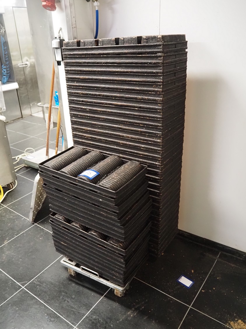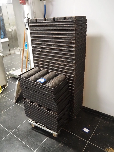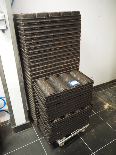 Large amount of baking forms, inside dimensions each form: (5x) 305 mm x 120 mm x 75 mm, (4x) 290 mm x 120 mm x 45 mm, total dimensions: 700 mm x 680 mm x 1450 mm.