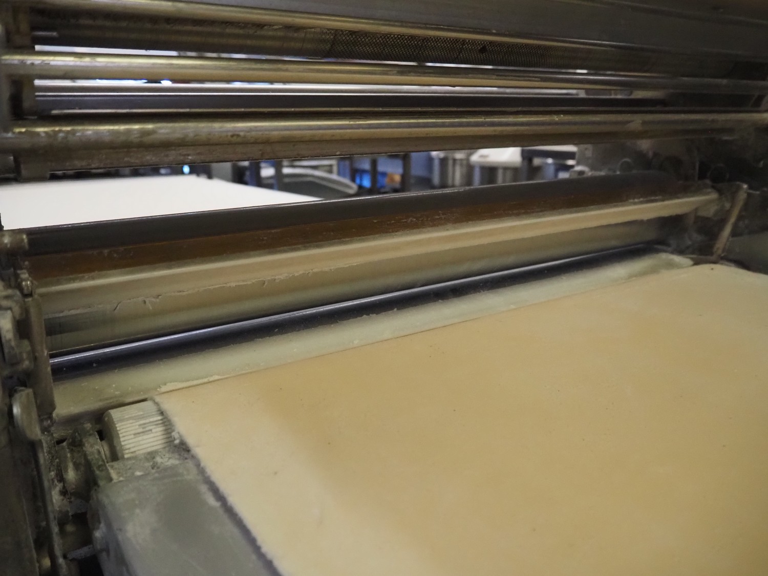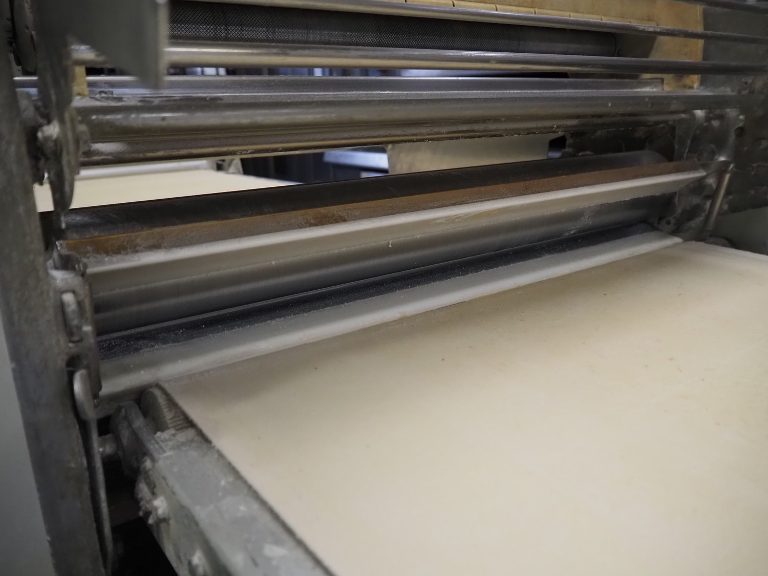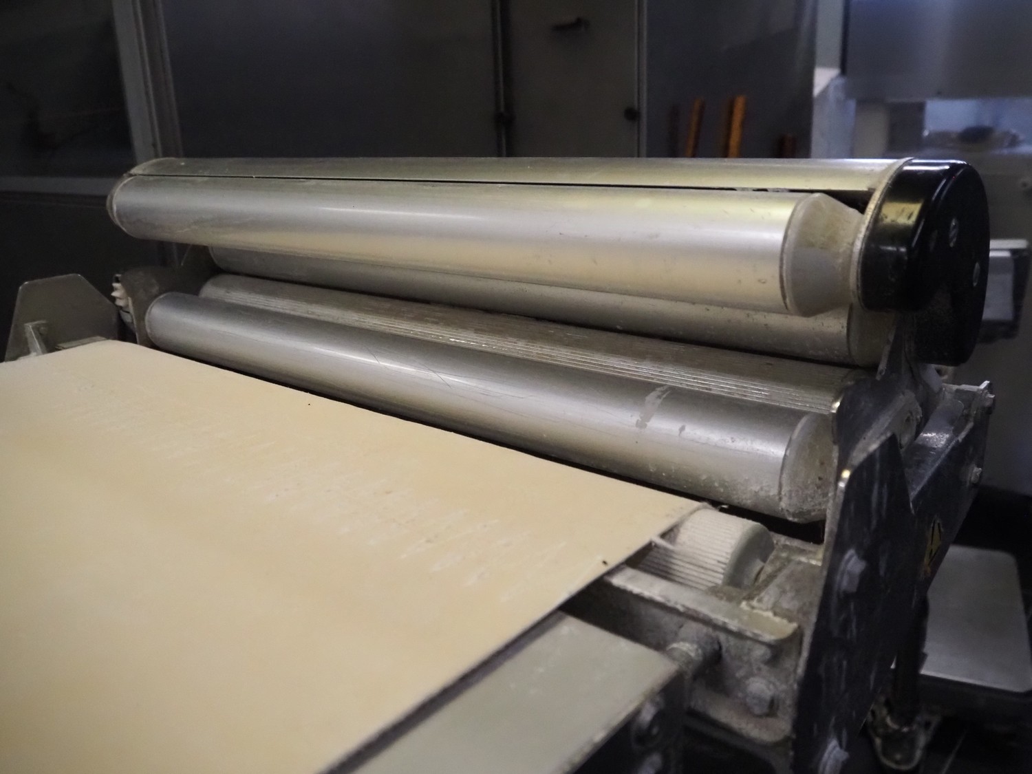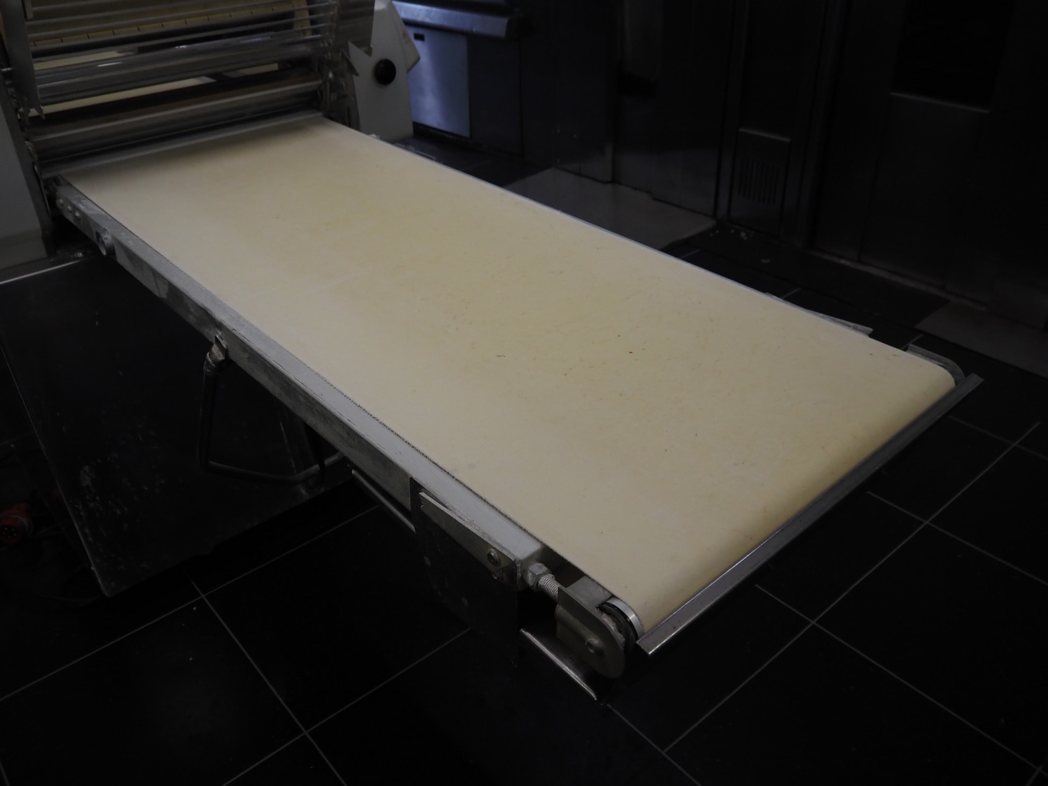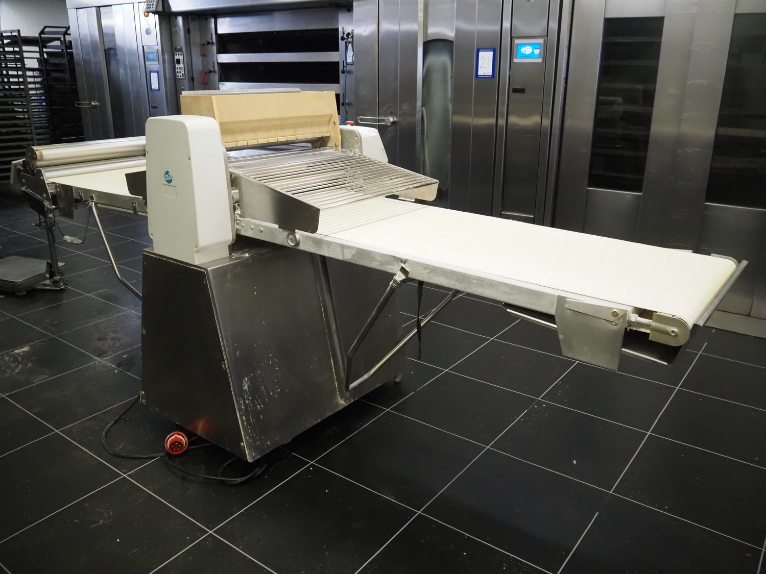 Rondo Doge mobile dough sheeter, cloth belt, belt width: (2x) 600 mm, roller width: 390 mm, total dimensions: 3250 mm x 1160 mm x 1320 mm.