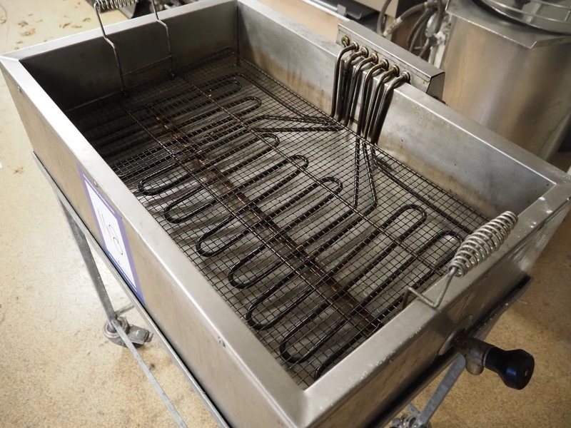 S/s doughnut fryer on trolley, inside dimensions: 760 mm x 460 mm, total dimensions: 940 mm x 560 mm x 1080 mm.