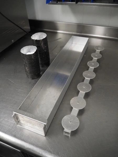 S/s filling frame with cool plate, dyes: (21x) 70 mm, total dimensions: 560 mm x 300 mm x 60 mm. Cool plate dimensions: 560 mm x 245 mm x 90 mm.