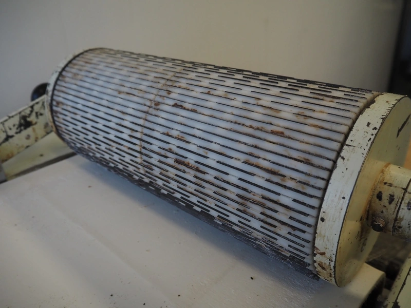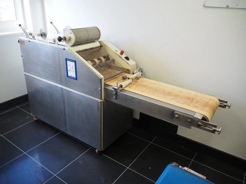 Mobile dough lattice machine, plastic belt, belt width: 370 mm, s/s mesh belt width: 370 mm, roller width: 390 mm, total dimensions: 2200 mm x 630 mm x 1240 mm.