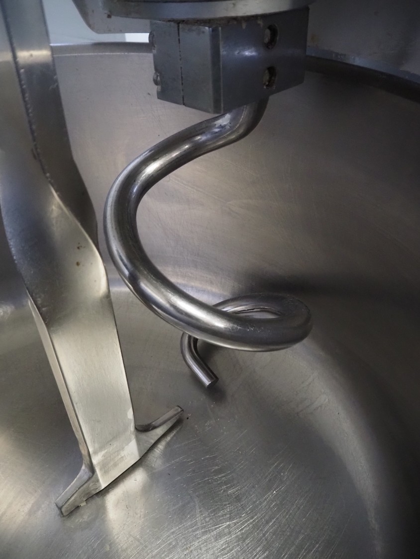 Sinmag Bakery Equipment spiral mixer, model: KM-80T, serial number: 1008049, year of construction: 2011.01, 380 V, 3 Ph, 50 Hz, 12.3 A, 5.25 kW, machine weight: 390 kg, s/s bowl, bowl dimensions: Ø 670 mm x 380 mm, total dimensions: 1250 mm x 700 mm x 1300 mm.