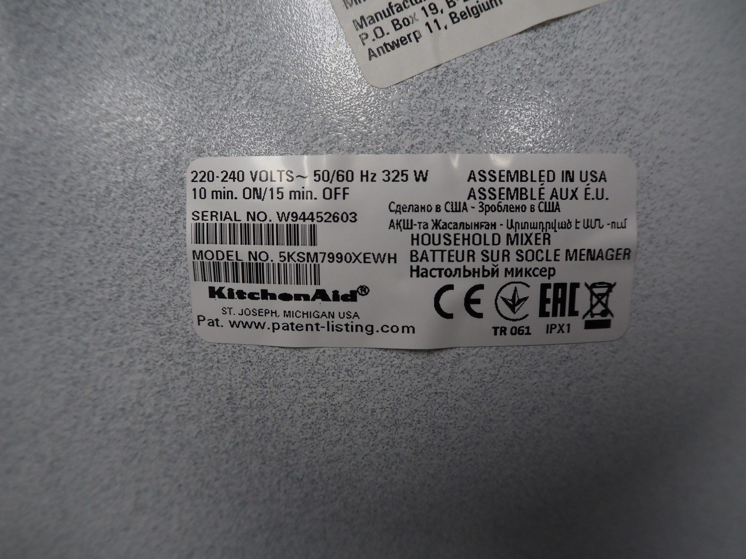 KitchenAid mixer, model: 5KSM7990XEWH, serial number: W94452603, 220/240 V, 50/60 Hz, 325 W, s/s bowl: Ø 240 mm x 180 mm, total dimensions: 360 mm x 300 mm x 420 mm.