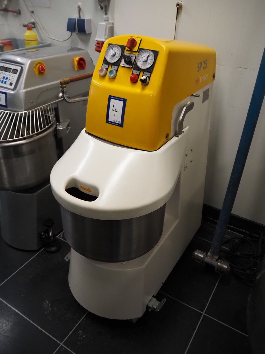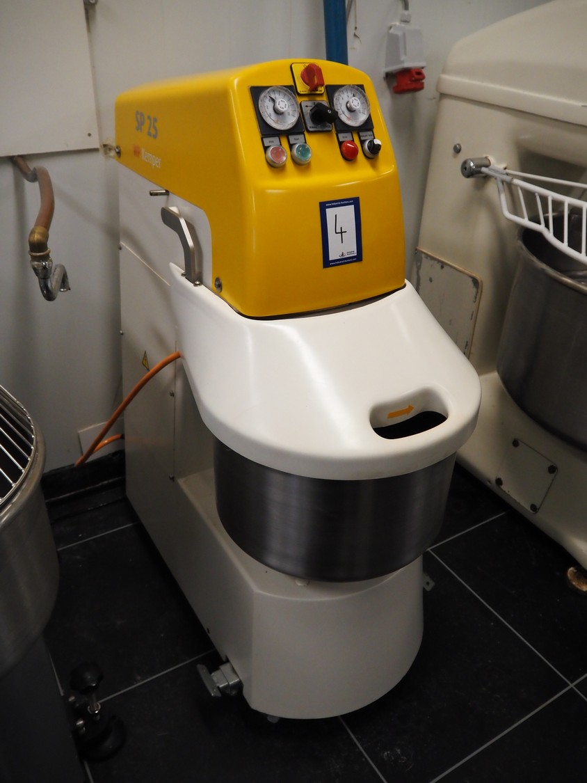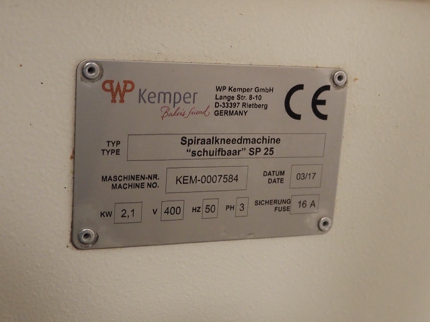 WP Kemper GmbH mobile mixer, type: Spiraalkneedmachine "schuifbaar" SP 25, machine number: KEM-0007584, year of construction: 03/17, 400 V, 3 Ph, 50 Hz, 16 A, 2.1 kW, volume: 25 liter, s/s bowl, bowl dimensions: Ø 430 mm x 280 mm, total dimensions: 940 mm x 470 mm x 1200 mm.