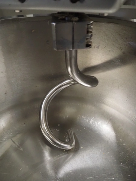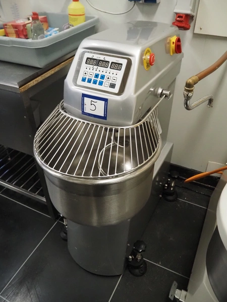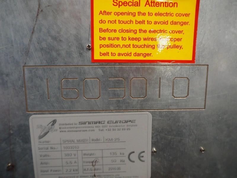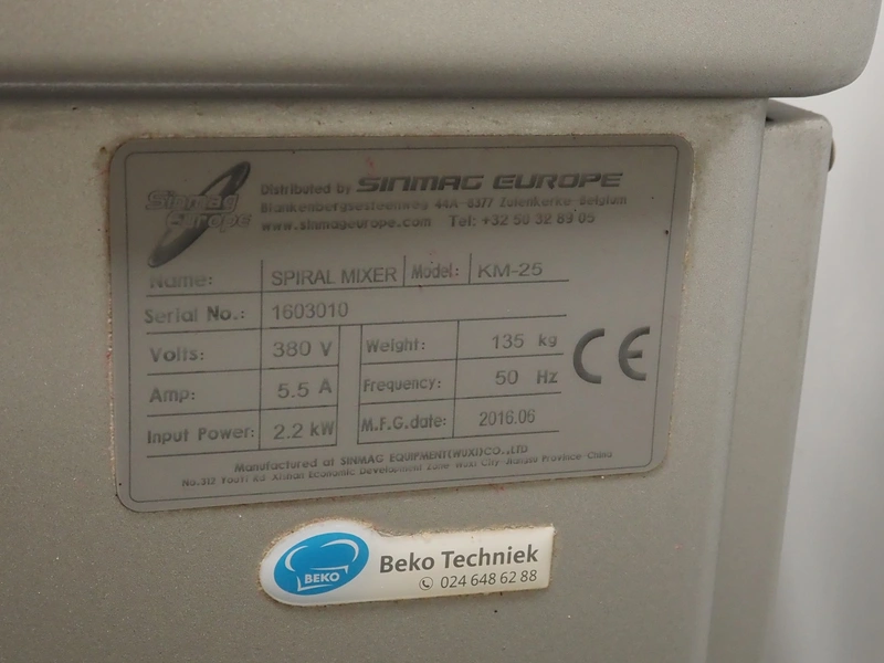 Sinmac Europe mobile spiral mixer, model: KM-25, serial number: 1603010, year of construction: 2016.06, 380 V, 50 Hz, 5.5 A, 2.2 kW, machine weight: 135 kg, s/s bowl, bowl dimensions: Ø 440 mm x 300 mm, total dimensions: 850 mm x 480 mm x 1060 mm.
