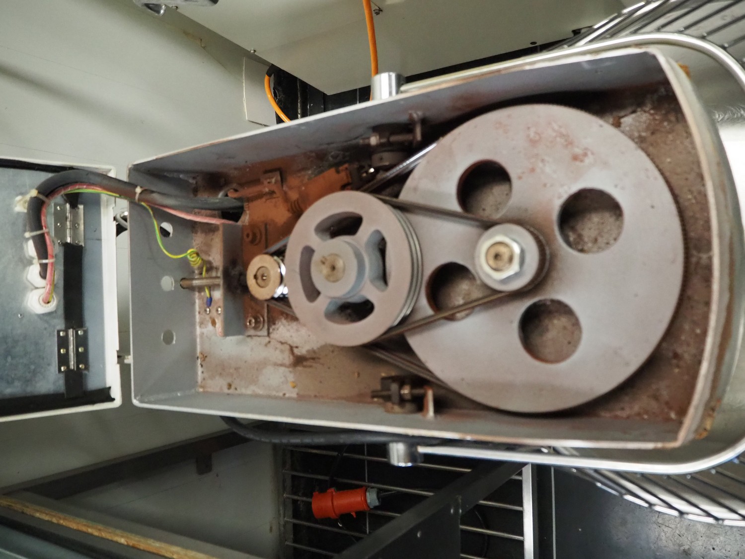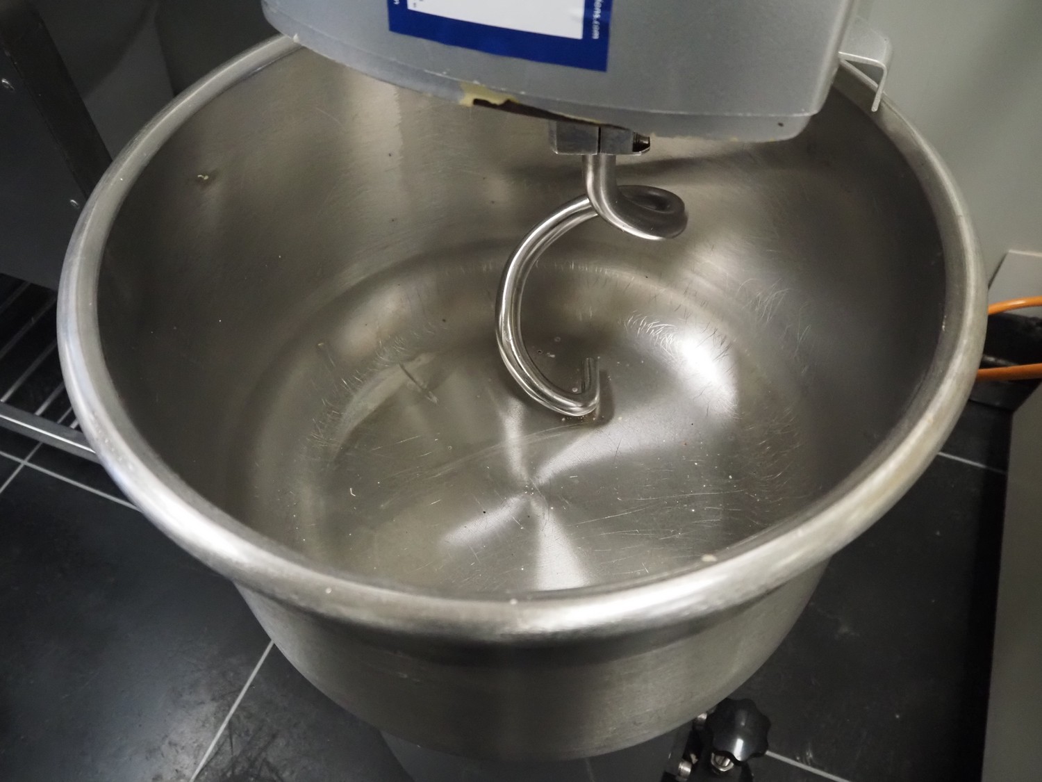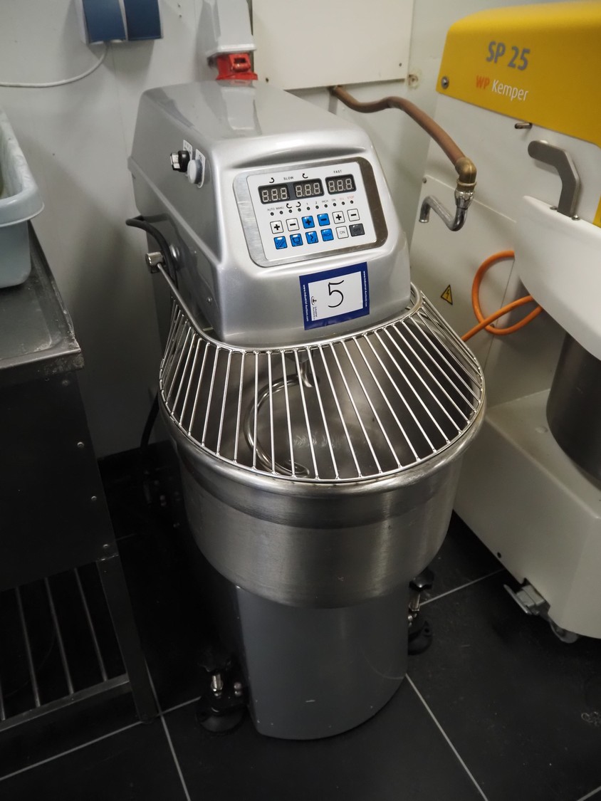 Sinmac Europe mobile spiral mixer, model: KM-25, serial number: 1603010, year of construction: 2016.06, 380 V, 50 Hz, 5.5 A, 2.2 kW, machine weight: 135 kg, s/s bowl, bowl dimensions: Ø 440 mm x 300 mm, total dimensions: 850 mm x 480 mm x 1060 mm.