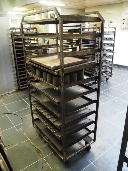 2 trolleys with plates, 10 floors, floor dimensions: (10x) 800 mm x 570 mm, total dimensions: (2x) 940 mm x 600 mm x 1910 mm.