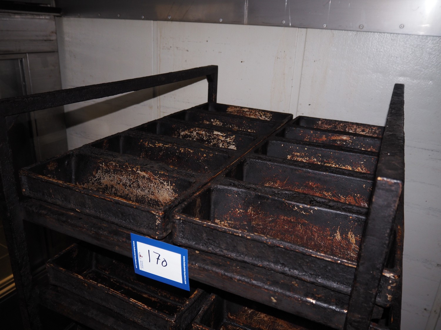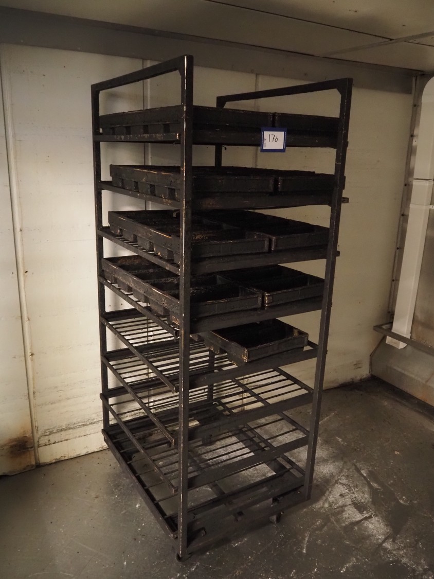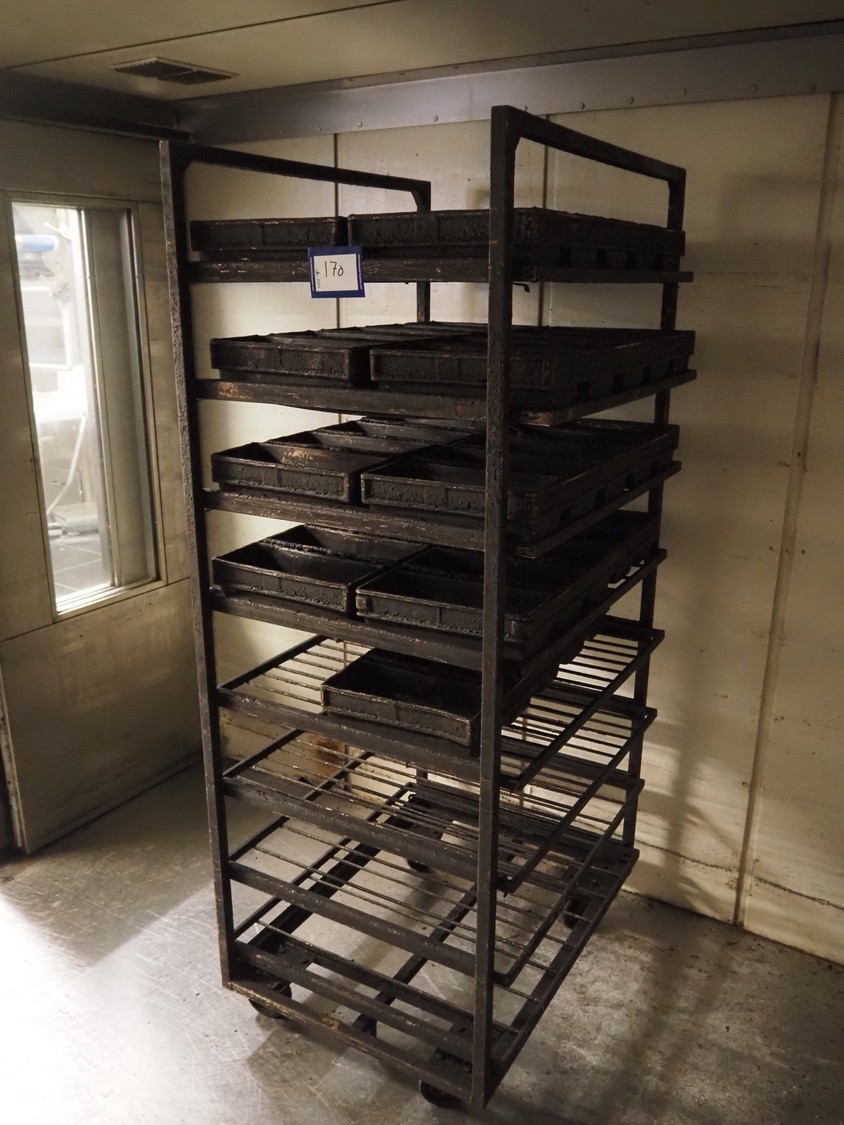 Trolley with baking forms, 8 floors, floor dimensions: (8x) 750 mm x 740 mm, total dimensions: 830 mm x 640 mm x 1760 mm.
