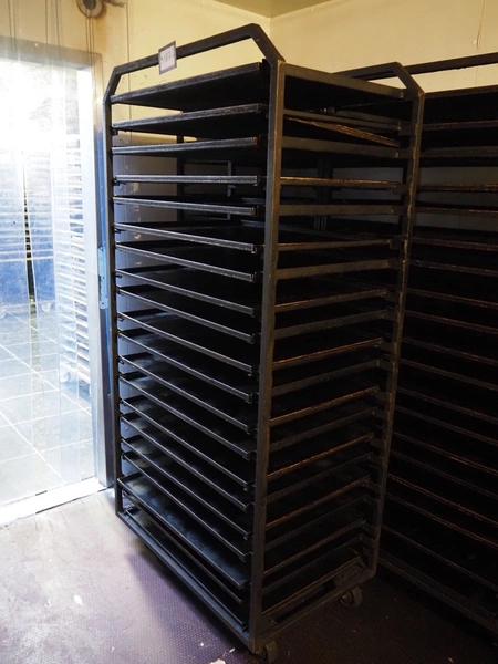 3 trolleys with plates, 10 floors, floor dimensions: (10x) 800 mm x 570 mm, total dimensions: (3x) 940 mm x 600 mm x 1910 mm.