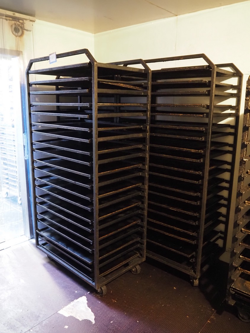 3 trolleys with plates, 10 floors, floor dimensions: (10x) 800 mm x 570 mm, total dimensions: (3x) 940 mm x 600 mm x 1910 mm.