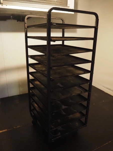 4 trolleys with plates, 18 floors, floor dimensions: (18x) 780 mm x 600 mm, total dimensions: (4x) 820 mm x 670 mm x 1760 mm.