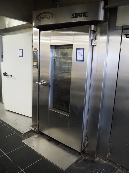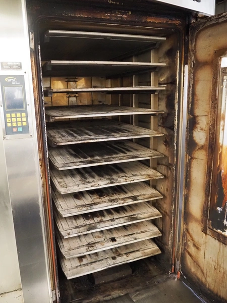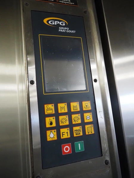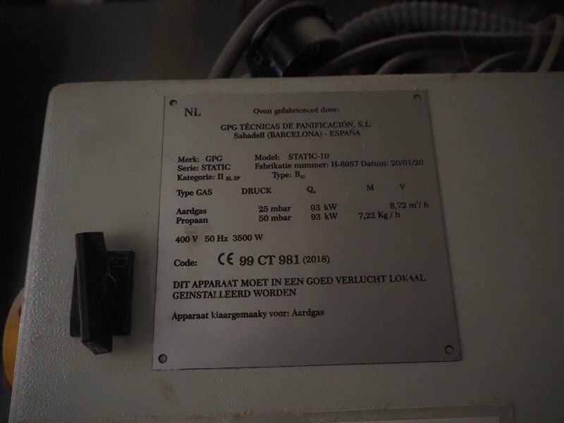 Grupo Prat Gouet oil-fired multi deck oven, model: STATIC-10, number: H-8957, year of construction: 20/01/20, 400 V, 50 Hz, 3500 W, 10 decks, dimensions decks: 1280 mm x 850 mm, dimensions oil burner: 1650 mm x 1400 mm x 2500 mm, total dimensions: 2400 mm x 1470 mm x 2300 mm.