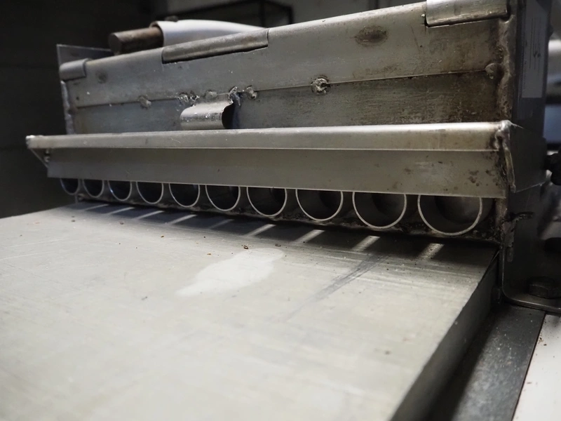 Steel almond press, dye: (10x) Ø 30 mm, chamber: 380 mm x 110 mm x 100 mm, total dimensions: 1260 mm x 460 mm x 1030 mm.