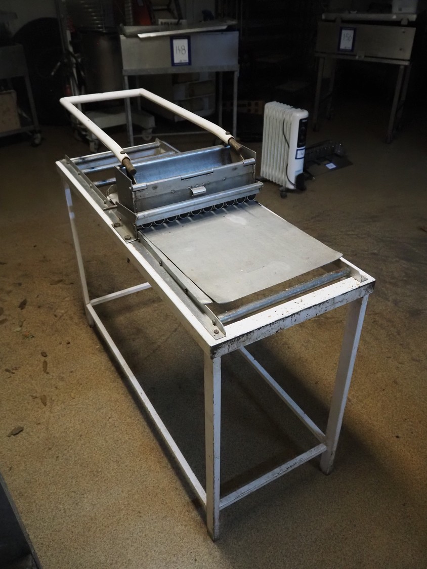 Steel almond press, dye: (10x) Ø 30 mm, chamber: 380 mm x 110 mm x 100 mm, total dimensions: 1260 mm x 460 mm x 1030 mm.