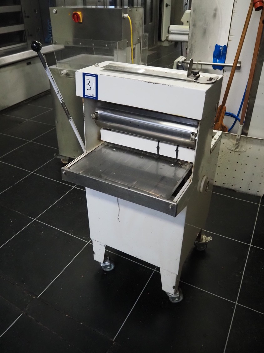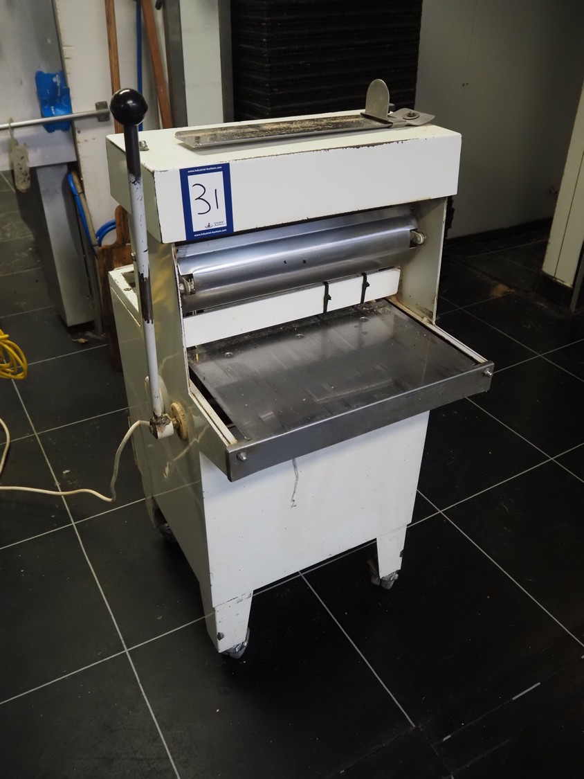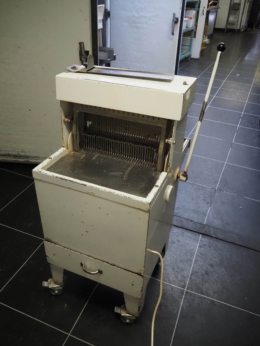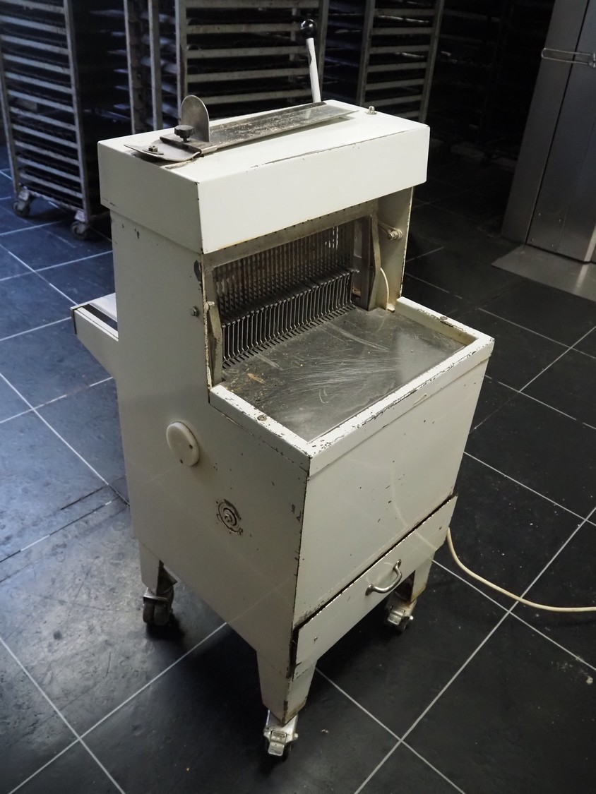 Mobile bread slicer, 33 knives, distance between knives: 10 mm, total dimensions: 650 mm x 570 mm x 1290 mm.