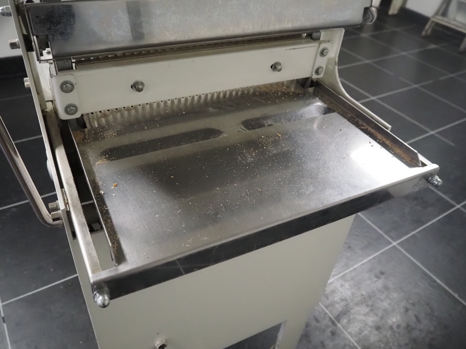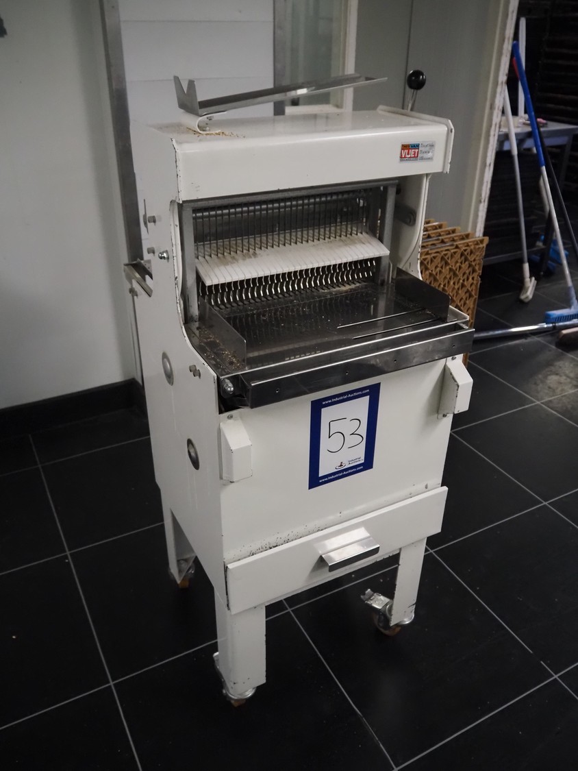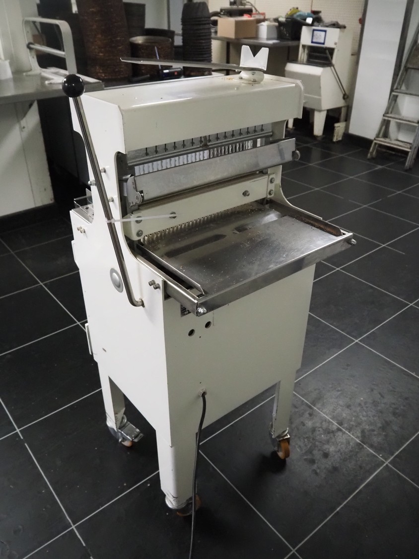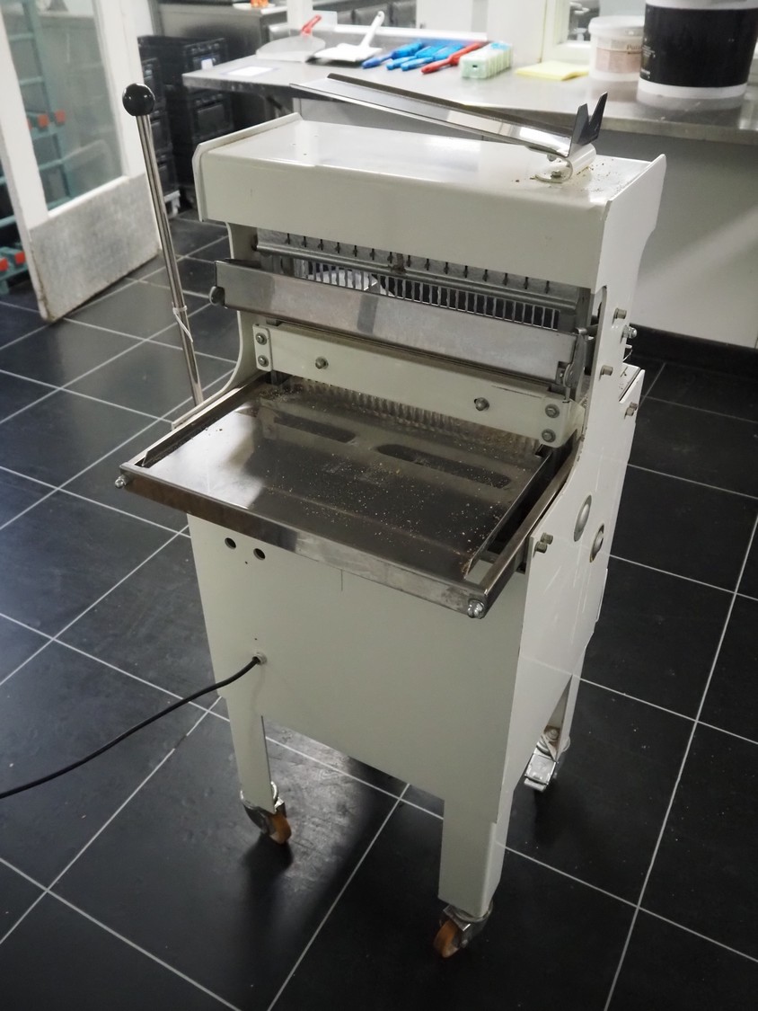 N.V. Van Lierde-Boons S.A. mobile bread slicer, type: VLO 40/12.5, number: 9811029, 300 V, 3 Ph, 50 Hz, 0.5 kW, 30 knives, distance between knives: 12.5 mm, total dimensions: 650 mm x 630 mm x 1310 mm.