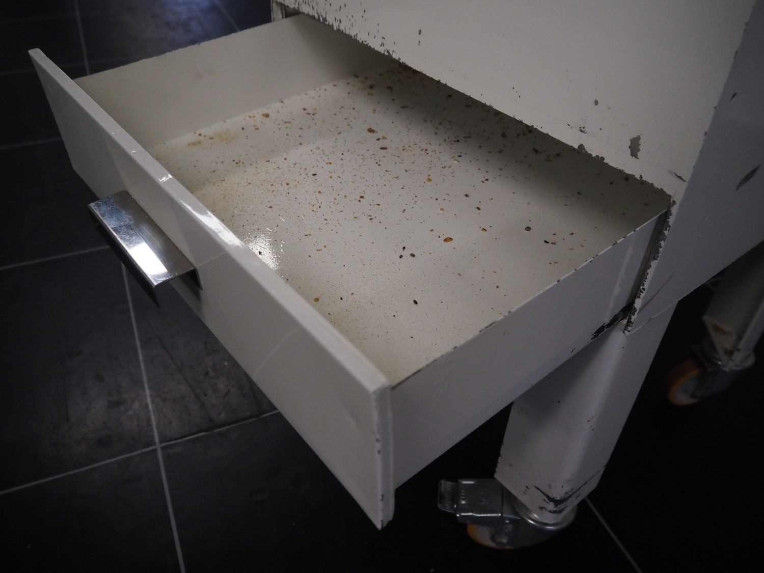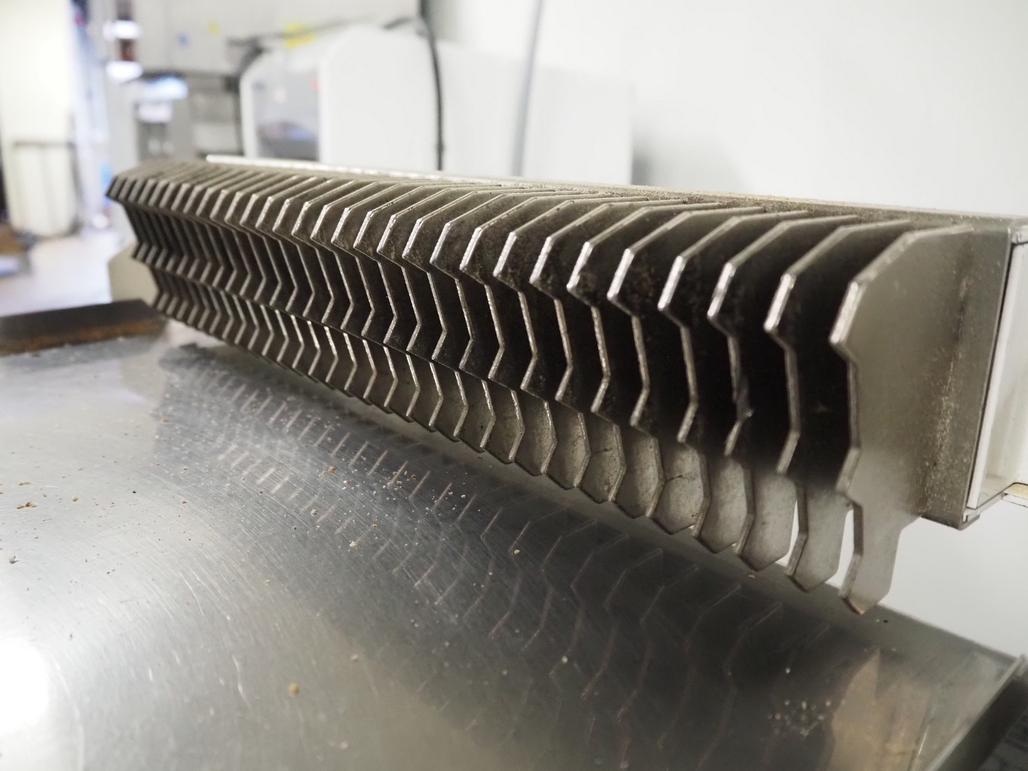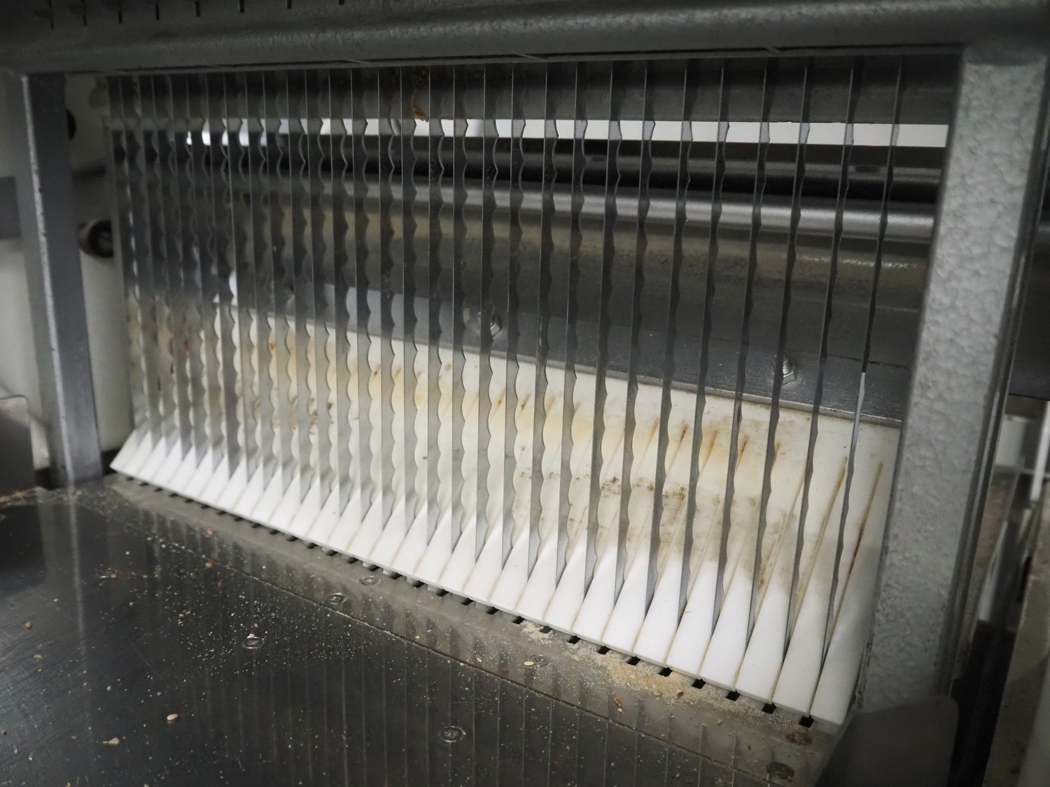 N.V. Van Lierde-Boons S.A. mobile bread slicer, type: VLO 40/12.5, number: 9811029, 300 V, 3 Ph, 50 Hz, 0.5 kW, 30 knives, distance between knives: 12.5 mm, total dimensions: 650 mm x 630 mm x 1310 mm.