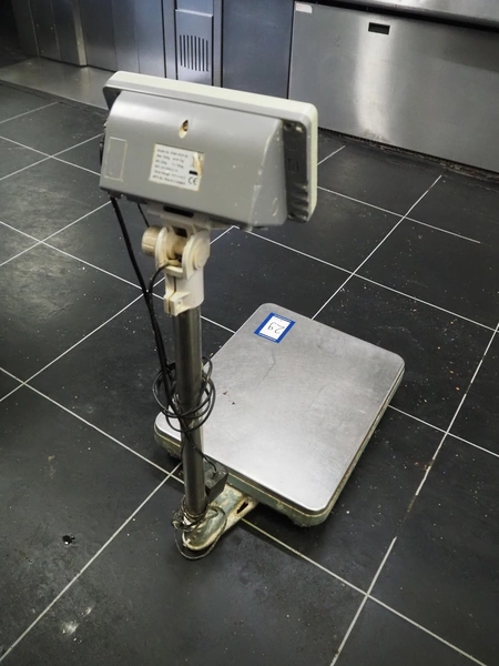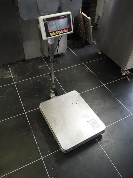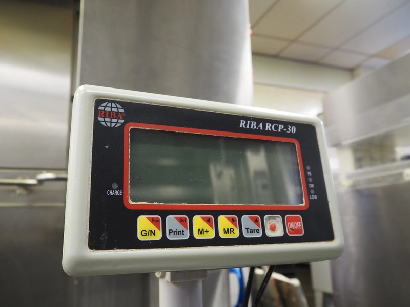 Riba weighing scale, model number: RIBA RCP-30, serial number: AA120012-14, maximum: 150 kg, minimum: 200 g, e=d= 10 g, T=-150 kg, temperature range: -10°C / +40°C, scale: 520 mm x 420 mm, total dimensions: 680 mm x 420 mm x 870 mm.
