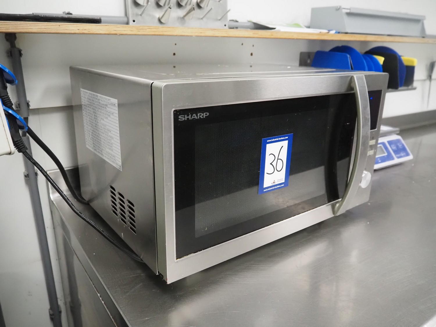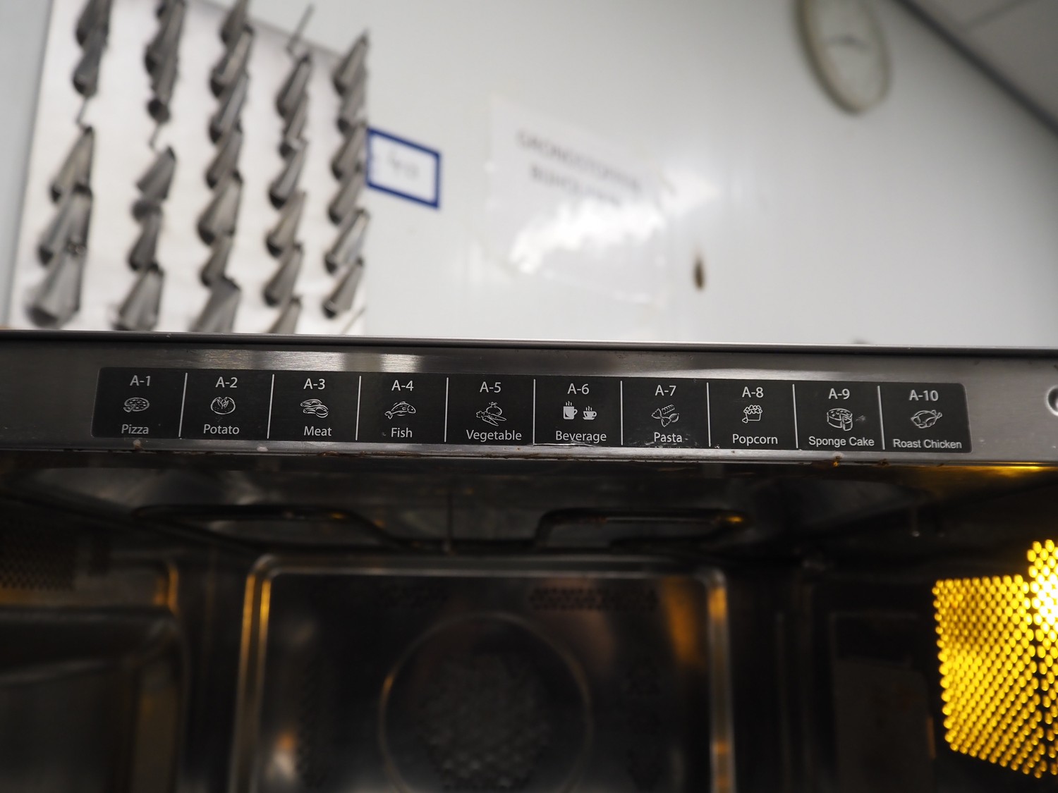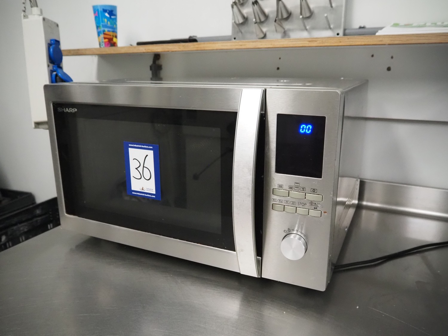 Sharp microwave oven, model: R982STWE, serial number: 181001352310120240, 230/240 V, 50 Hz, microwave 1000 W, grill 1400 W, dimensions: 560 mm x 480 mm x 330 mm.