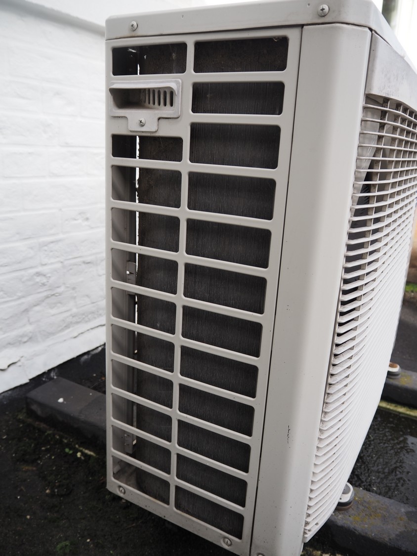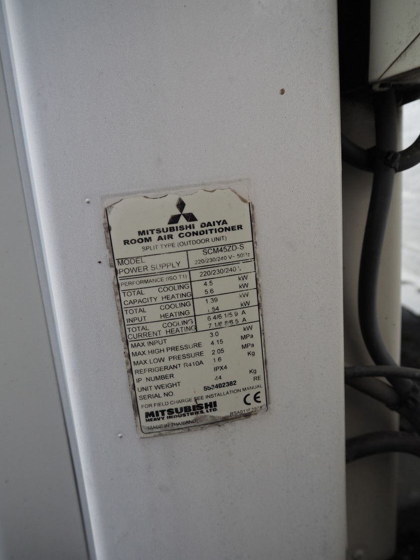 Mitsubishi outside unit for airconditioning, model: SCM45ZD-S, serial number: 553402382, 220/230/240 V, 50 Hz, 4.5 kW, weight: 44 kg, refrigerant: R410A, dimensions: 900 mm x 320 mm x 650 mm.