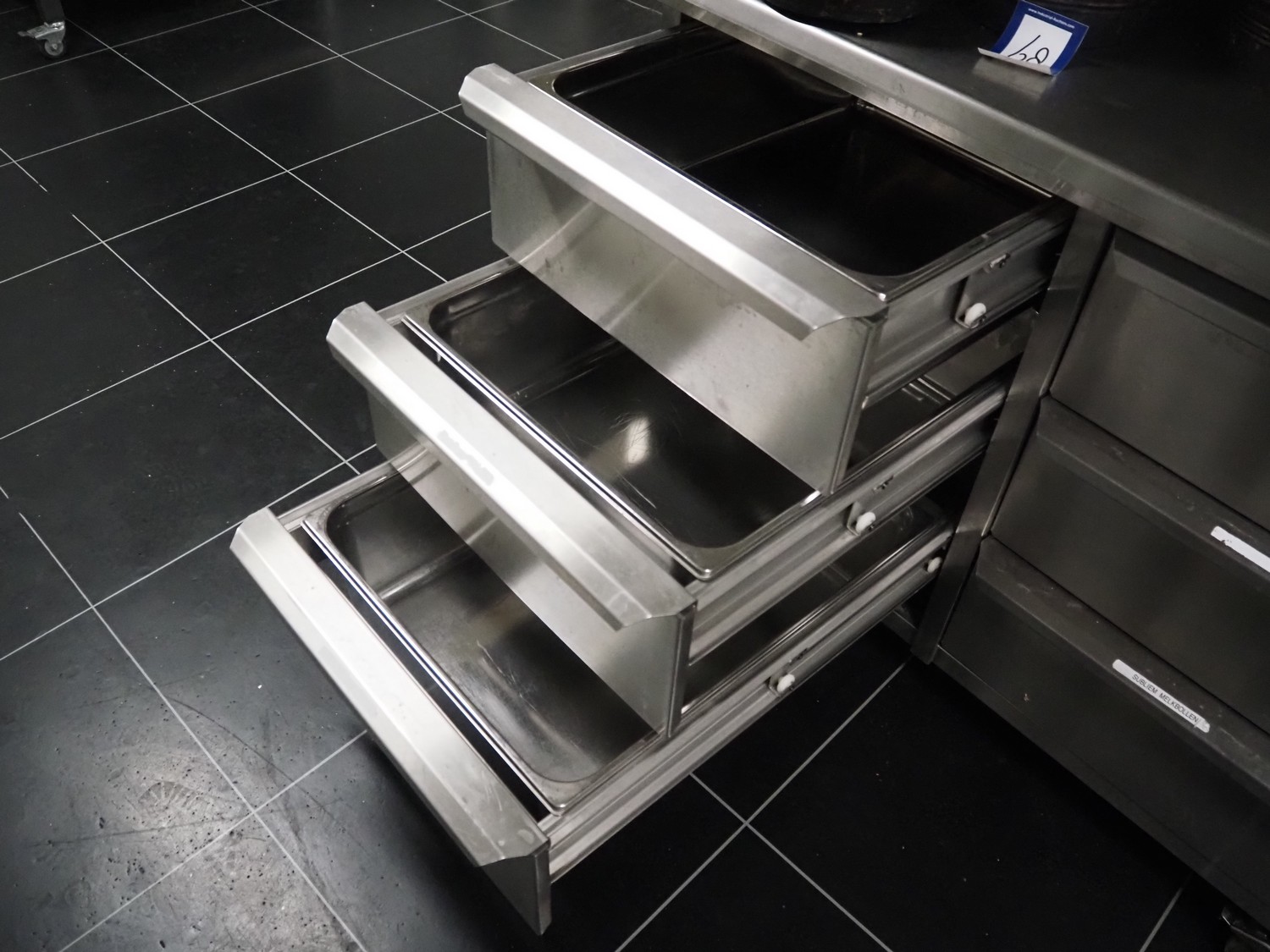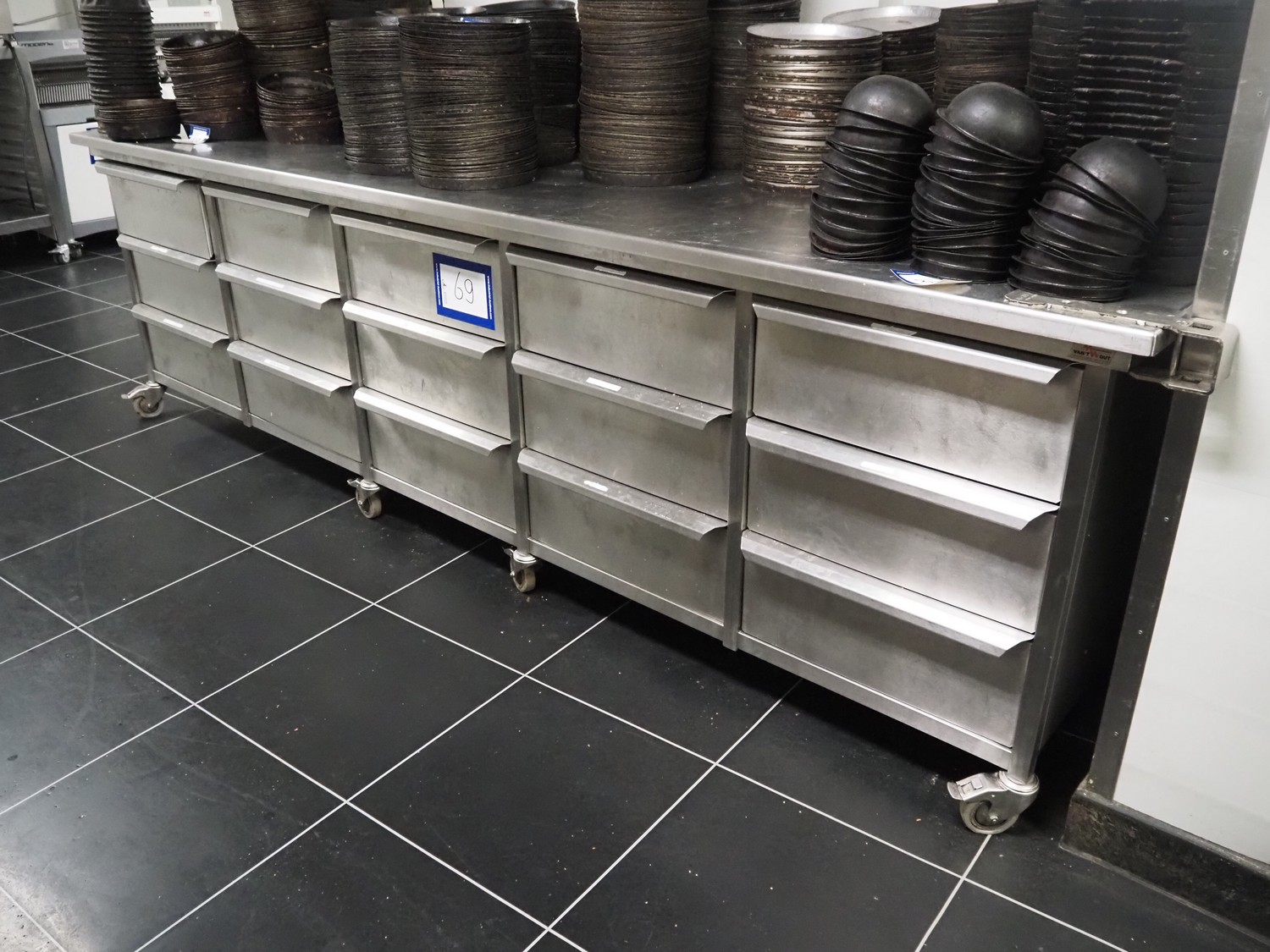 S/s mobile cabinet with drawers for gastronorm bins, 15 drawers, drawers dimensions: 520 mm x 630 mm x 200 mm, total dimensions: 2200 mm x 1000 mm x 950 mm.