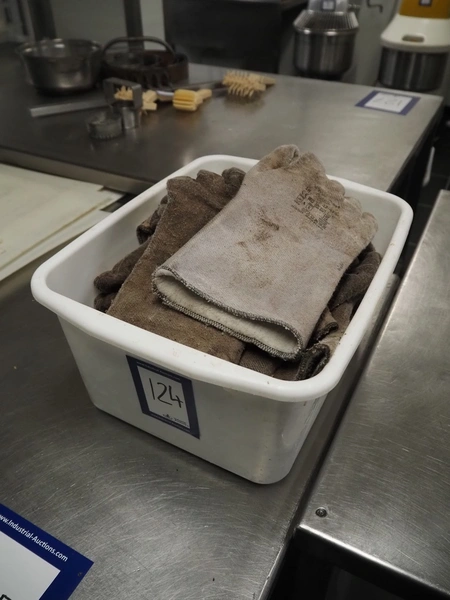 Plastic crate with large amount of gloves, dimensions: 420 mm x 320 mm x 200 mm.