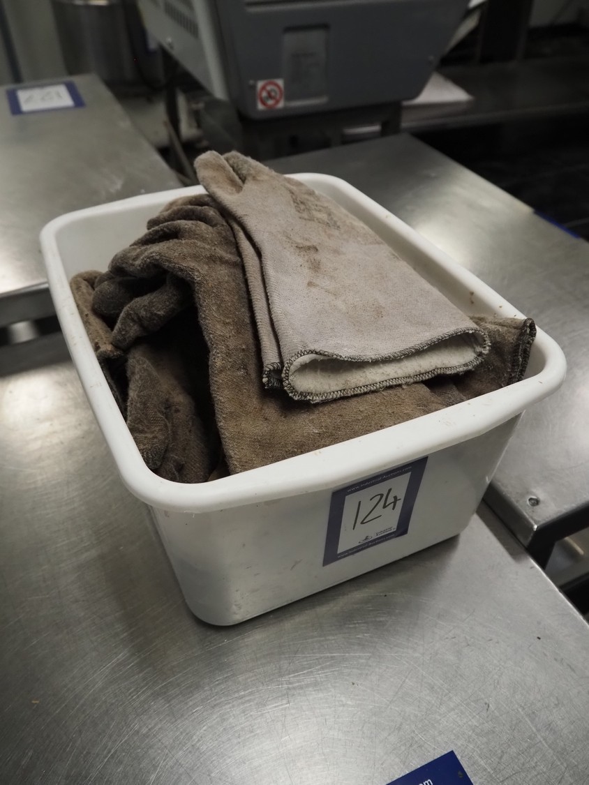 Plastic crate with large amount of gloves, dimensions: 420 mm x 320 mm x 200 mm.