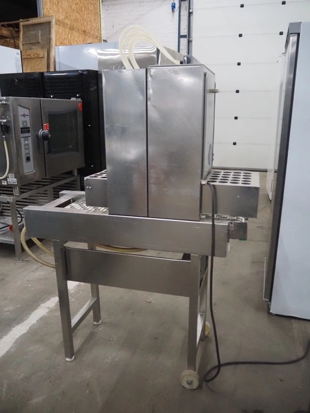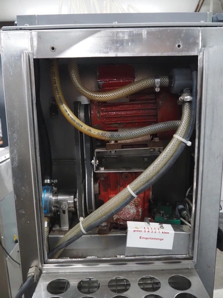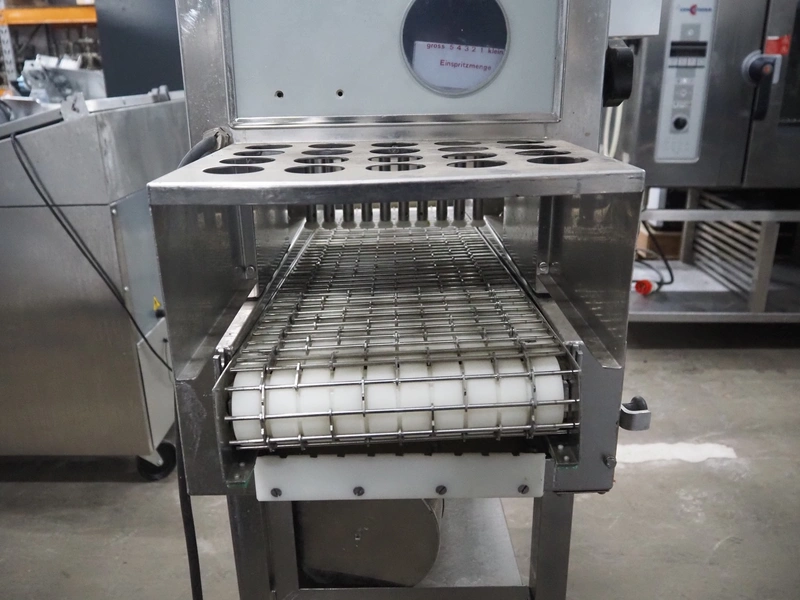 Pökomat mobile injector, type: R10/300, fabrication number: 582.1, 380 V, 1.8 A, 0.75 kW, weight: 126 kg, 10 needles, s/s belt, belt width: 300 mm, clearance: 300 mm x 140 mm, total dimensions: 1170 mm x 430 mm x 1750 mm.