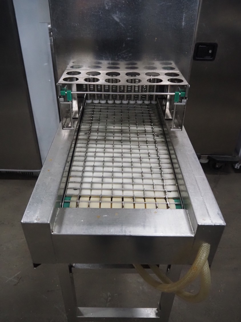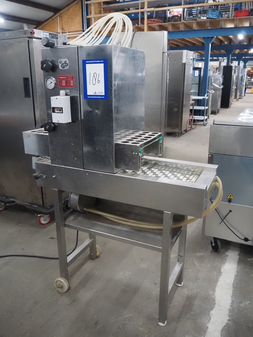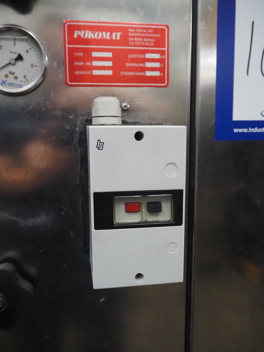 Pökomat mobile injector, type: R10/300, fabrication number: 582.1, 380 V, 1.8 A, 0.75 kW, weight: 126 kg, 10 needles, s/s belt, belt width: 300 mm, clearance: 300 mm x 140 mm, total dimensions: 1170 mm x 430 mm x 1750 mm.