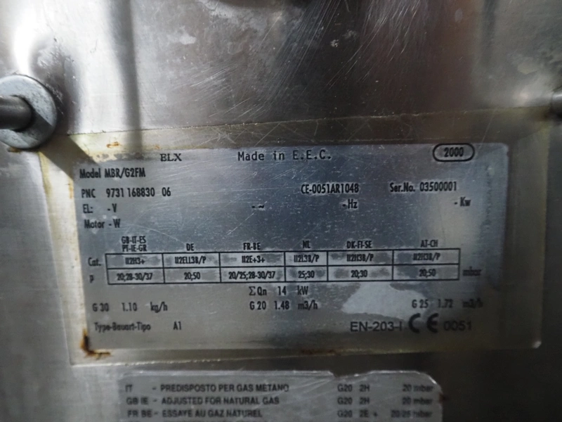 Zanussi braising pan, model: MBR/G2FM, serial number: 03500001, year of construction: 2000, gas heated, inside dimensions: 630 mm x 460 mm x 170 mm, total dimensions: 750 mm x 700 mm x 970 mm.