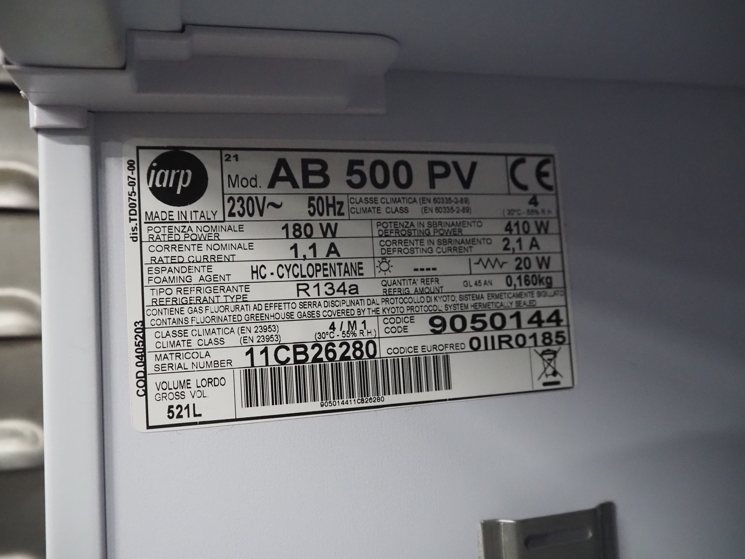 Iarp freezer, model: AB 500 PV, serial number: 11CB26280, 230 V, 50 Hz, 1.1 A/ 2.1 A, 180 W, refrigerant: R134a/0.160 kg, 4 floors, floor dimensions: 500 mm x 640 mm, total dimensions: 760 mm x 700 mm x 1700 mm.