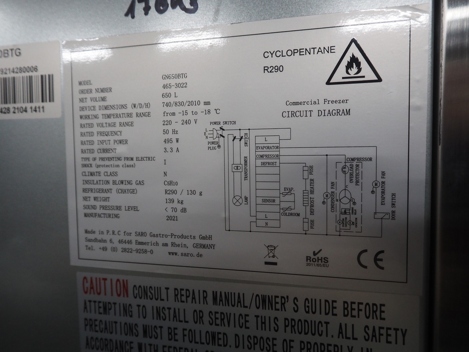 Freezer, model: GN650BTG, year of construction: 2021, 220-240 V, 50 Hz, 3.3 A, 495 W, refrigerant: R290/130 g, volume: 650 liter, weight: 139 kg, 3 floors, floor dimensions: (3x) 640 mm x 530 mm, total dimensions: 820 mm x 750 mm x 1880 mm.