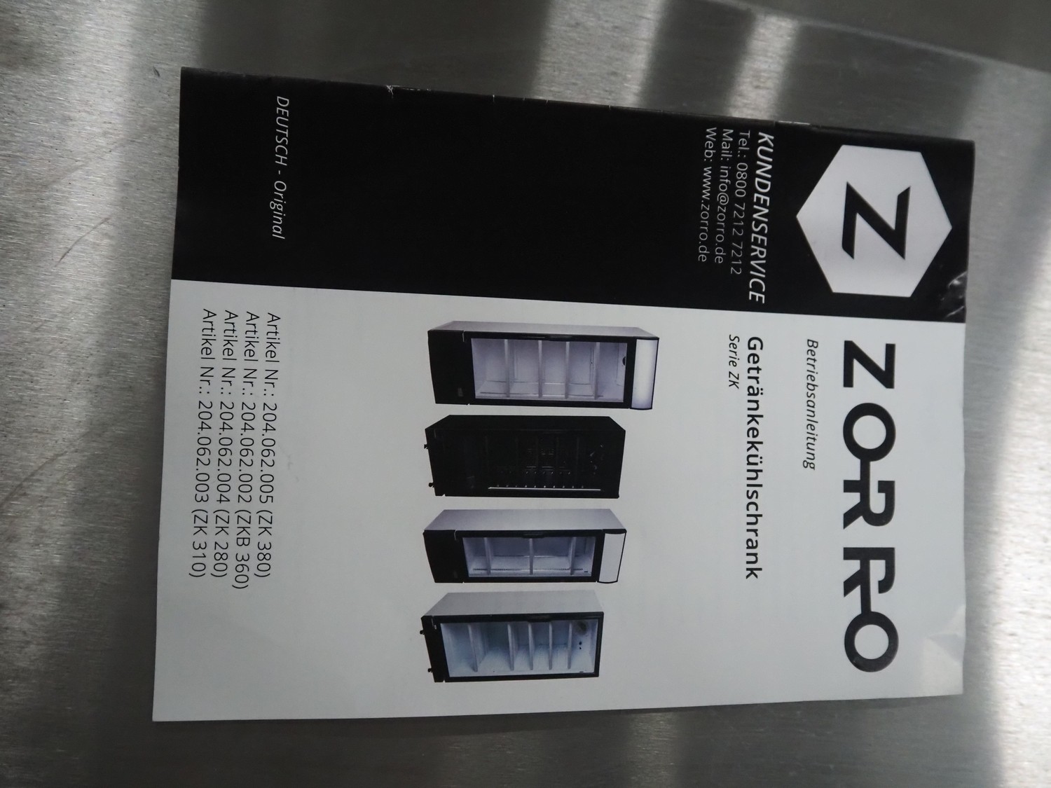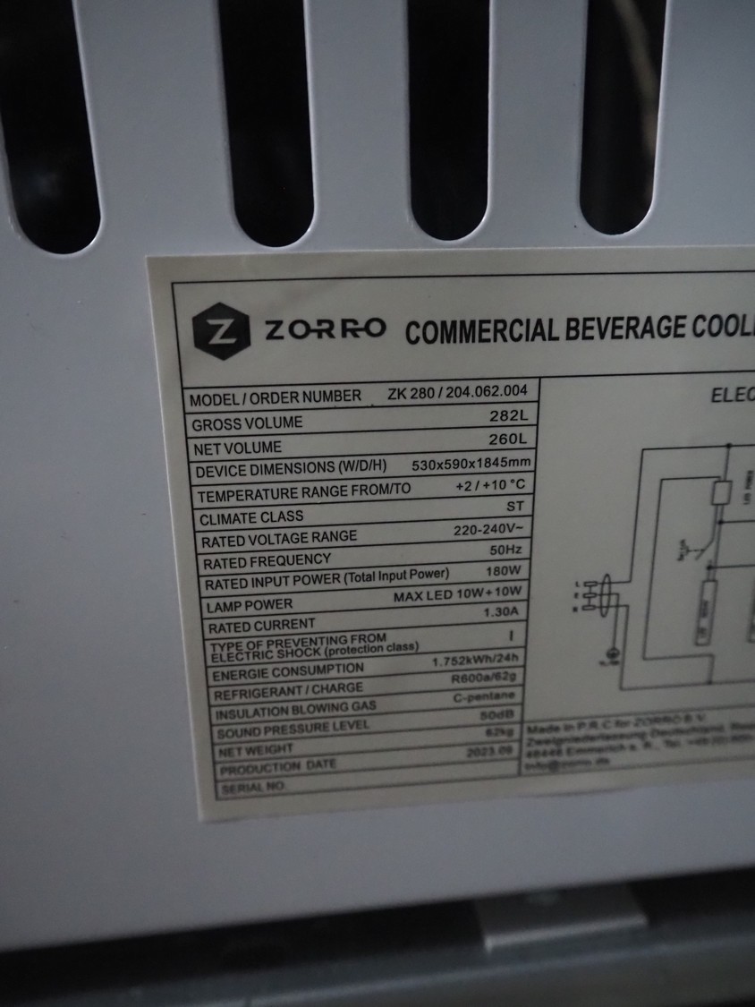 Zorro B.V. refrigerator, model: ZK 280 / 204.062.004, 220-240 V, 50 Hz, 1.3 A, 180 W, refrigerant: R600A/0.062 kg, volume: 282 liter, weight: 62 kg, 7 floors, floor dimensions: 430 mm x 380 mm, total dimensions: 540 mm x 540 mm x 1850 mm.