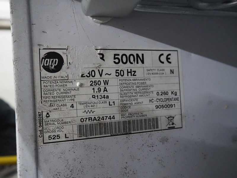 Iarp refrigerator, 230 V, 50 Hz, 1.9 A, 250 W, refrigerant: R134A/0.260 kg, volume: 525 liter, 6 floors, floor dimensions: 650 mm x 500 mm, total dimensions: 770 mm x 760 mm x 1700 mm. Including 7 plastic crates, dimensions: (7x) 500 mm x 300 mm x 180 mm.
