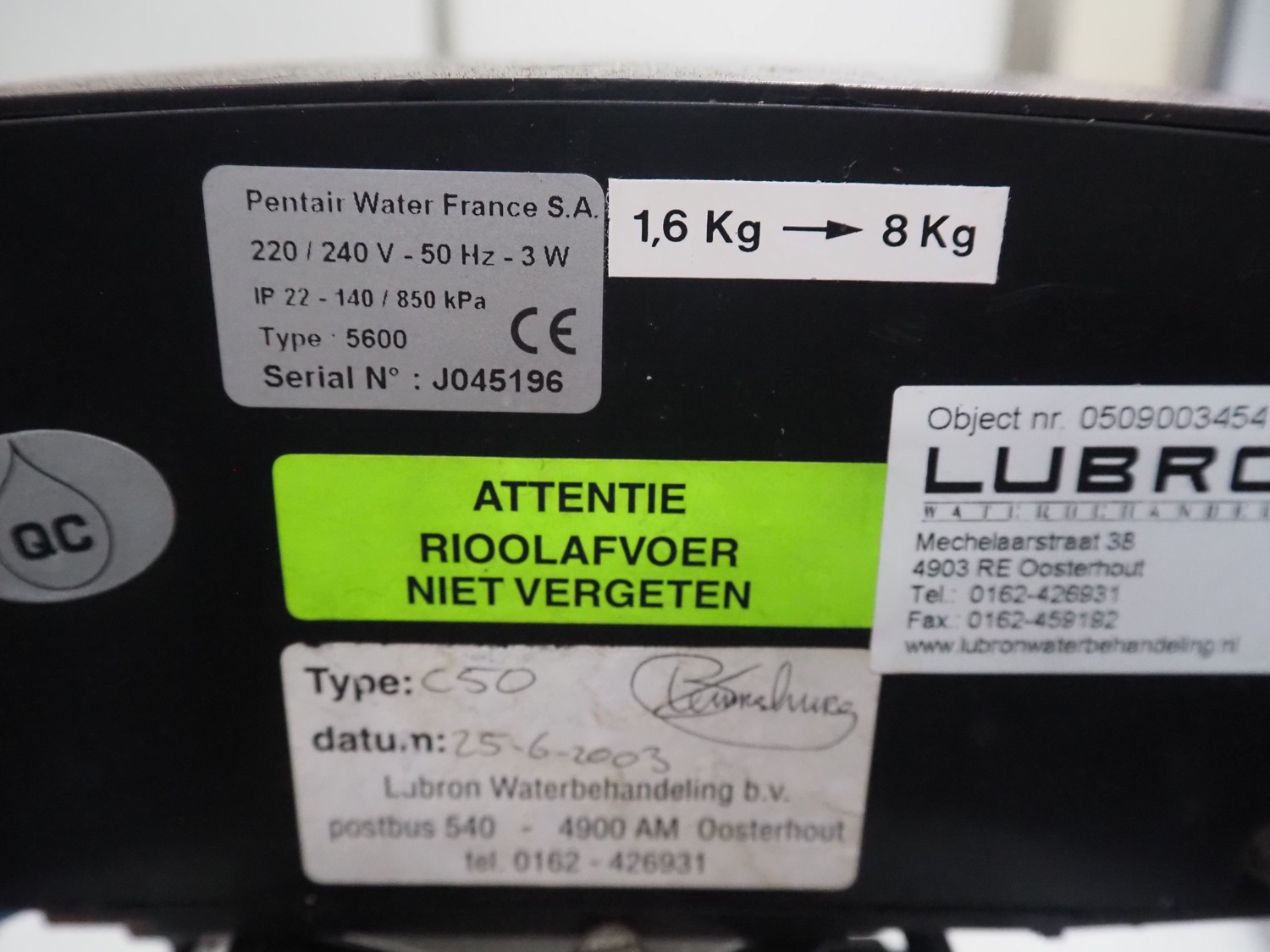 Compact water softener, type: 5600, serial number: J045196, 220/240 V, 50 Hz, 3 W, dimensions: 600 mm x 300 mm x 1100 mm.