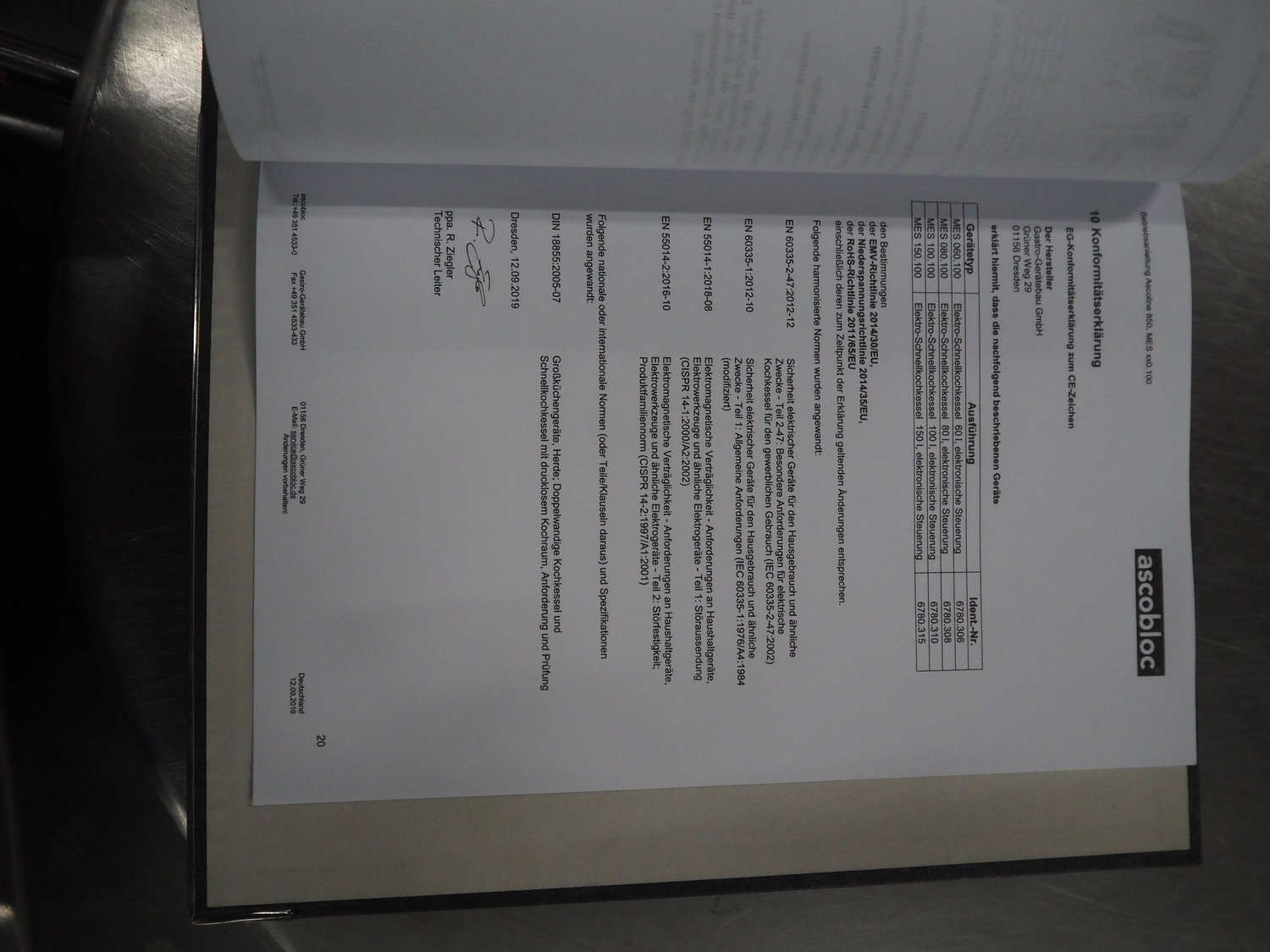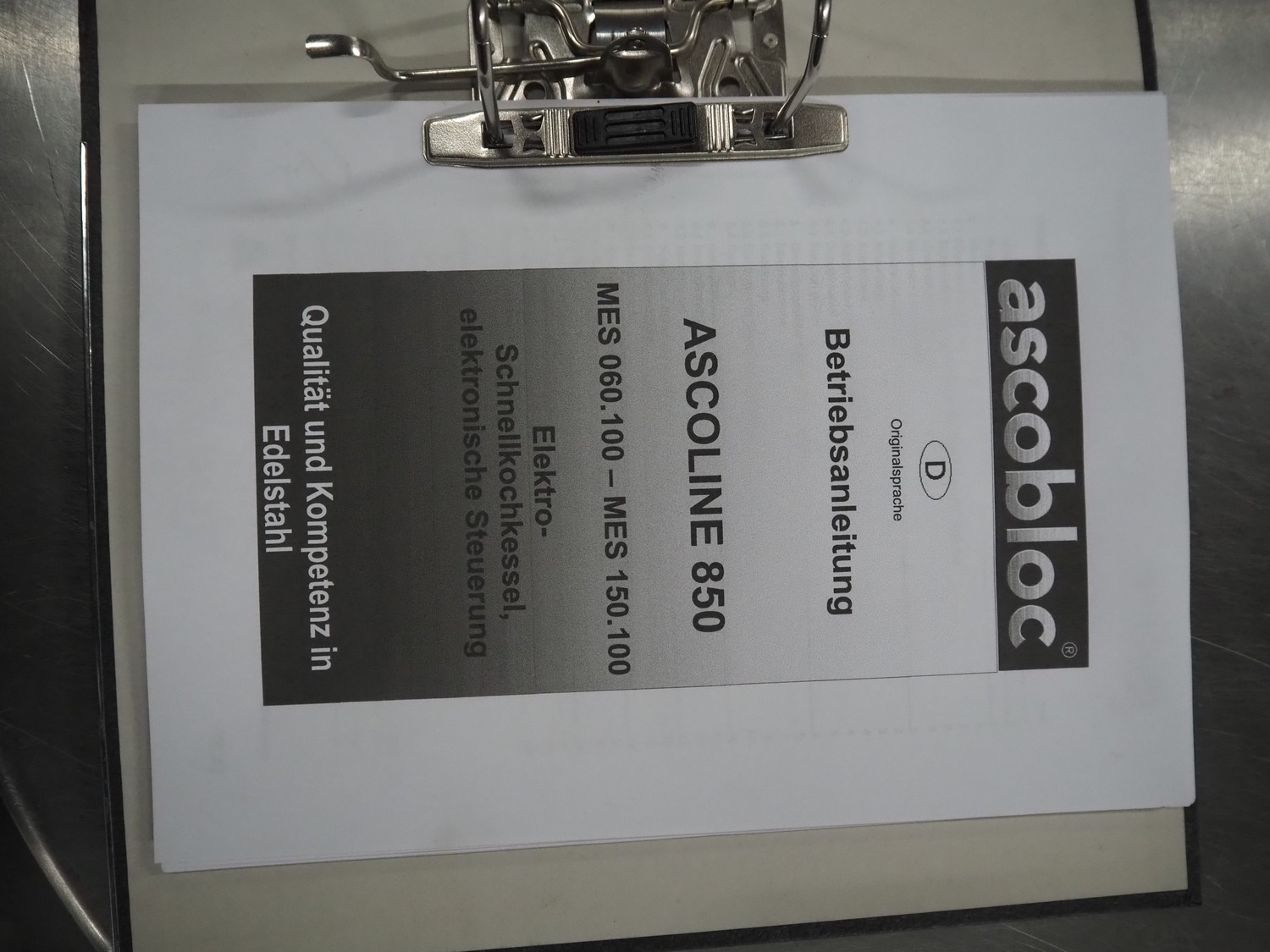 Ascobloc Gastro-Gerätebau GmbH cooking vessel, model: MES 100.100, serial number: 0043, year of construction: 2019, 230/400 V, 3 Ph, 50/60 Hz, 18.5 kA, inside dimensions: Ø 600 mm x 450 mm, total dimensions: 900 mm x 840 mm x 1000 mm.