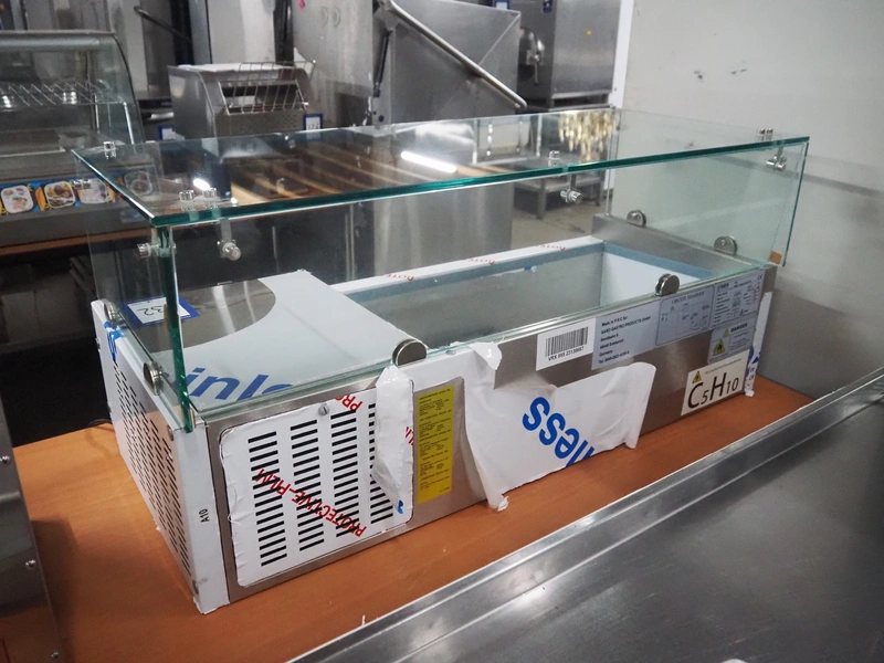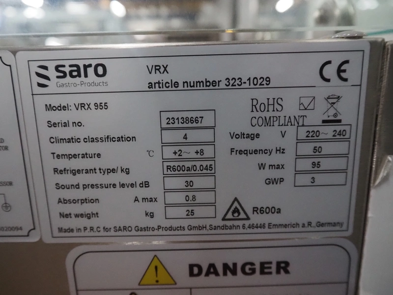 Saro Gastro-Products GmbH refrigerated showcase, model: VRX 955, serial number: 23138667, 220/240 V, 50 Hz, 0.8 A, maximum: 95 W, refrigerant: R600a/0.045, weight: 25 kg, dimensions: 950 mm x 400 mm x 440 mm.