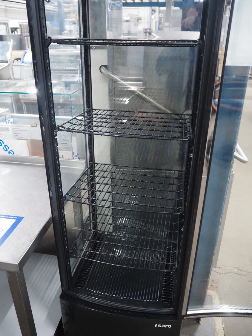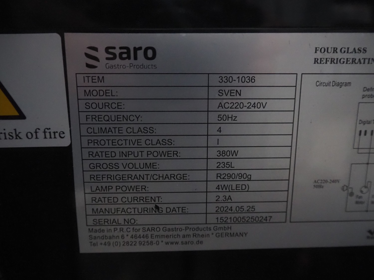 Saro Gastro-Products GmbH refrigerated showcase, model: SVEN, serial number: 1521005250247, year of construction: 25.05.2024, 220-240 V, 50 Hz, 2.3 A, 380 W, volume: 235 liter, refrigerant: R290/90 g, 4 floors, floor dimensions: (4x) 420 mm x 380 mm, total dimensions: 460 mm x 520 mm x 1700 mm.