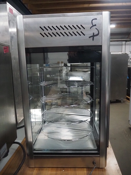 Saro Gastro-Products GmbH refrigerated showcase, model: ISABELL, serial number: 1224907110106, year of construction: 2022.07.11, 220-240 V, 50 Hz, 1.3, 1.3 A, 230 W, refrigerant: R600a/0.035 kg, volume: 108 liter, 4 floors, diameter floors: (4x) 350 mm, total dimensions: 500 mm x 470 mm x 860 mm.