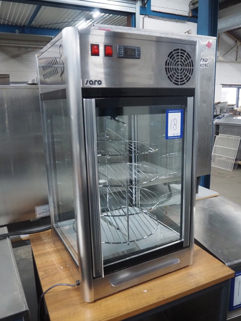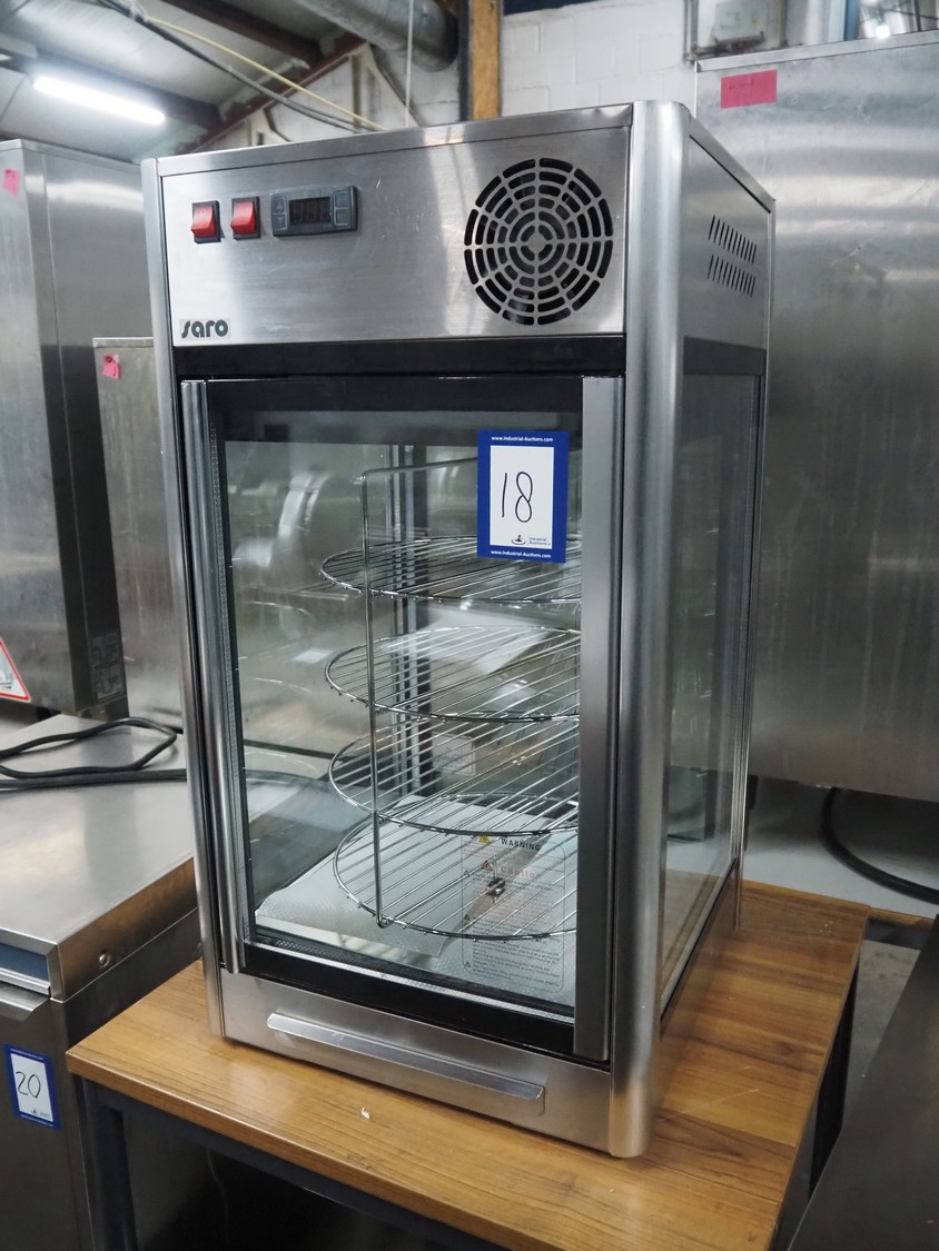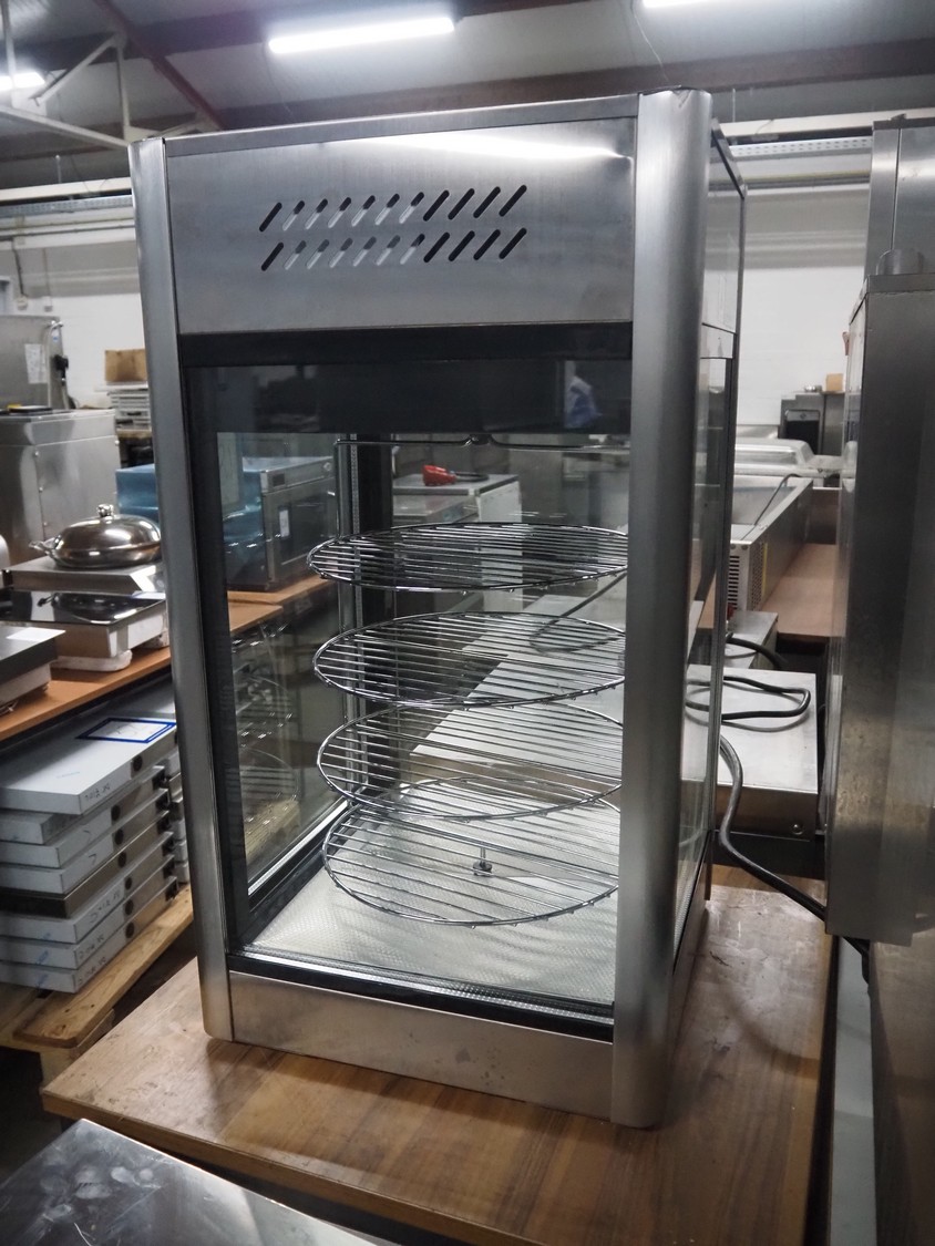 Saro Gastro-Products GmbH refrigerated showcase, model: ISABELL, serial number: 1224907110106, year of construction: 2022.07.11, 220-240 V, 50 Hz, 1.3, 1.3 A, 230 W, refrigerant: R600a/0.035 kg, volume: 108 liter, 4 floors, diameter floors: (4x) 350 mm, total dimensions: 500 mm x 470 mm x 860 mm.