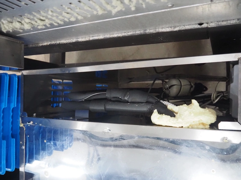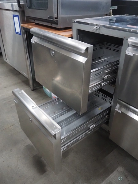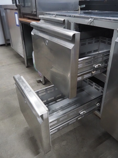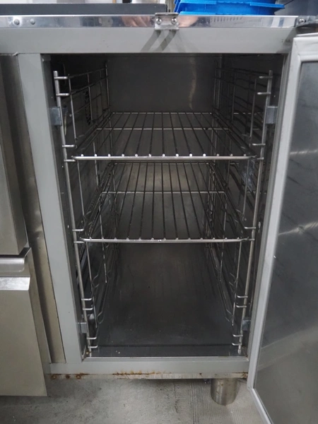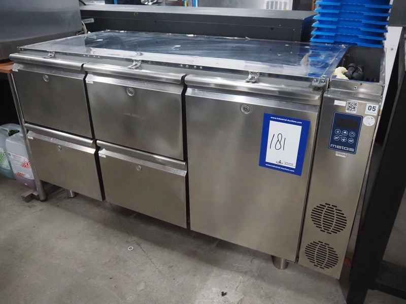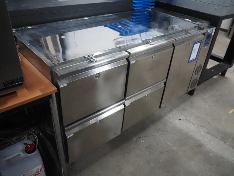 Metos refrigerated counter, type: KSTP03TN H71 C2, serial number: BN020247160, year of construction: 2018, 230 V, 50 Hz, 300 W, refrigerant: R452A/R404/R507/R449, 4 drawers, dimensions drawers: 560 mm x 300 mm x 300 mm, 2 floors, floor dimensions: 550 mm x 330 mm, total dimensions: 1550 mm x 700 mm x 900 mm. Missing top and external cool motor.