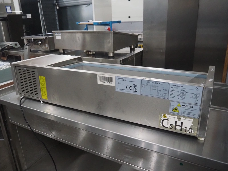 Combisteel B.V. refrigerated showcase, model: 7450.0015, serial number: 21175957, 230 V, 50 Hz, 0.8 A, 11 W, refrigerant: R600A/0.045 kg, weight: 28 kg, inside dimensions: 840 mm x 300 mm x 160 mm, total dimensions: 1200 mm x 400 mm x 250 mm.