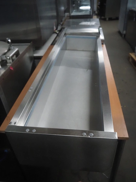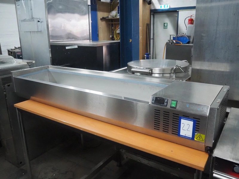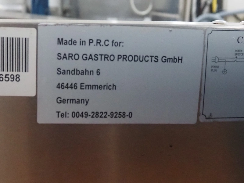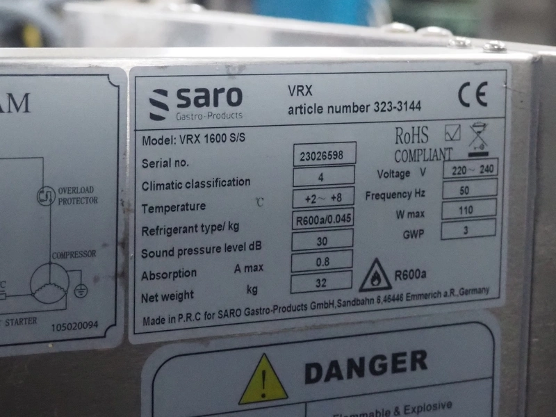 Saro Gastro-Products GmbH s/s counter top servery refrigerator,, model: VRX 1600 S/S, serial number: 23026598, 220-240 V, 3 Ph, 50 Hz, 110 W, refrigerant: R600a/0.045 kg, dimensions: 1600 mm x 395 mm x 280 mm.