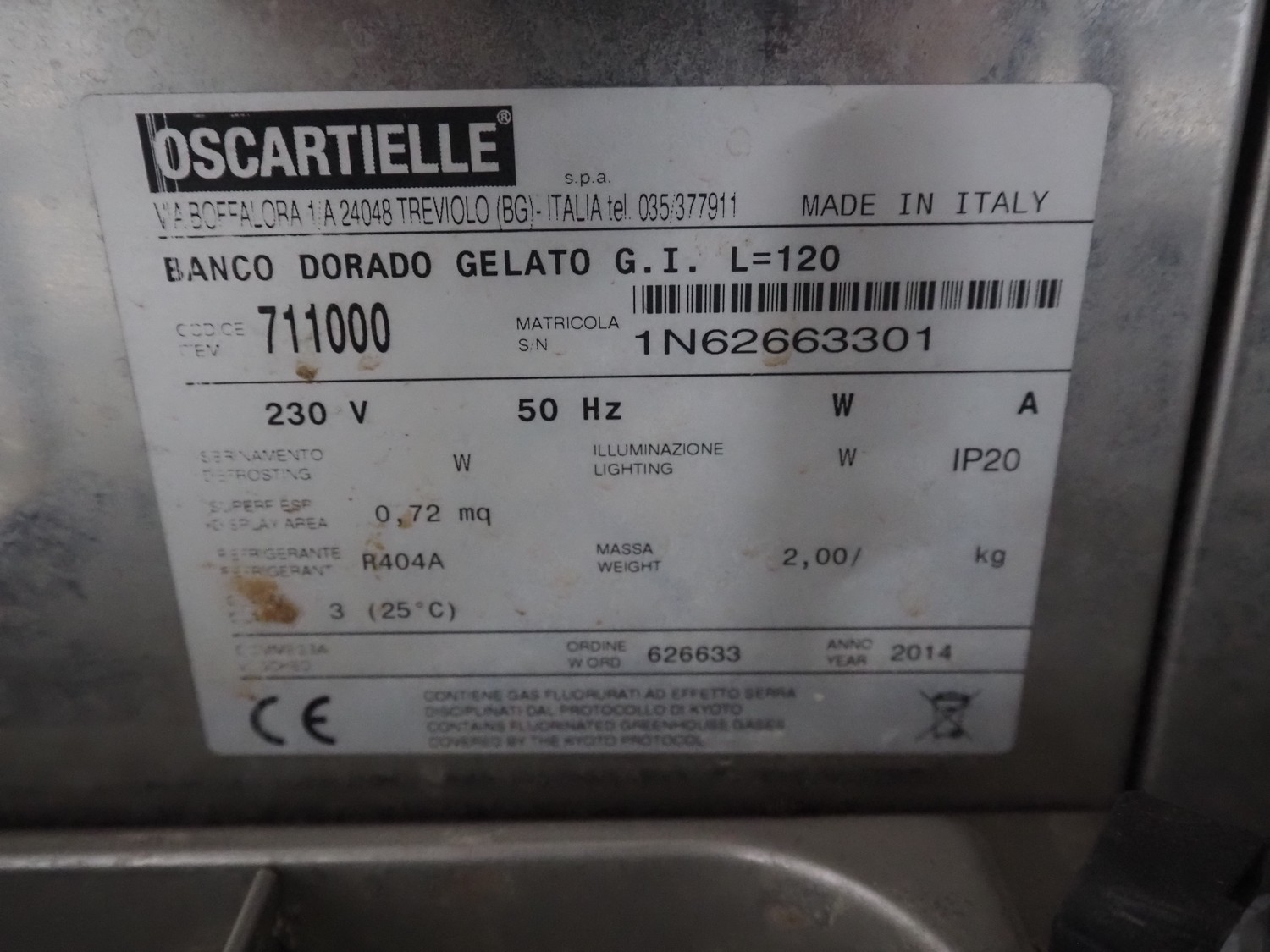 Oscartielle ice cream showcase, serial number: 1N62663301, year of construction: 2014, 230 V, 50 Hz, refrigerant: R404A/2.0 kg, inside dimensions: 1000 mm x 700 mm x 220 mm, total dimensions: 1200 mm x 1250 mm x 1500 mm.