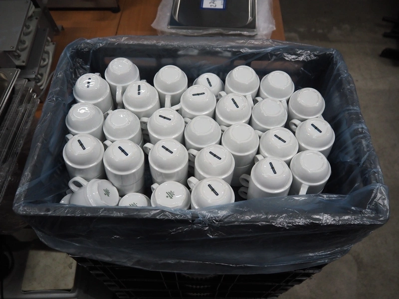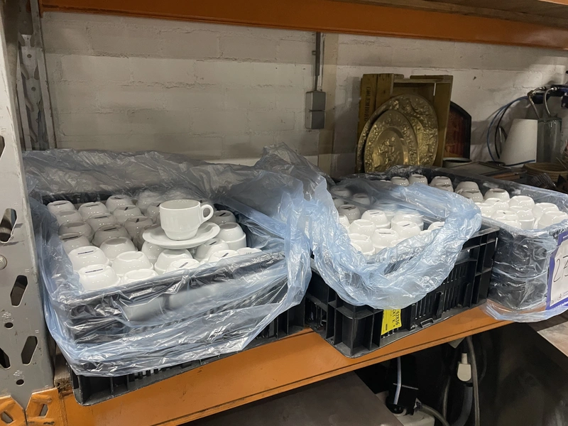 3 crates with cups and 4 crates with saucers.