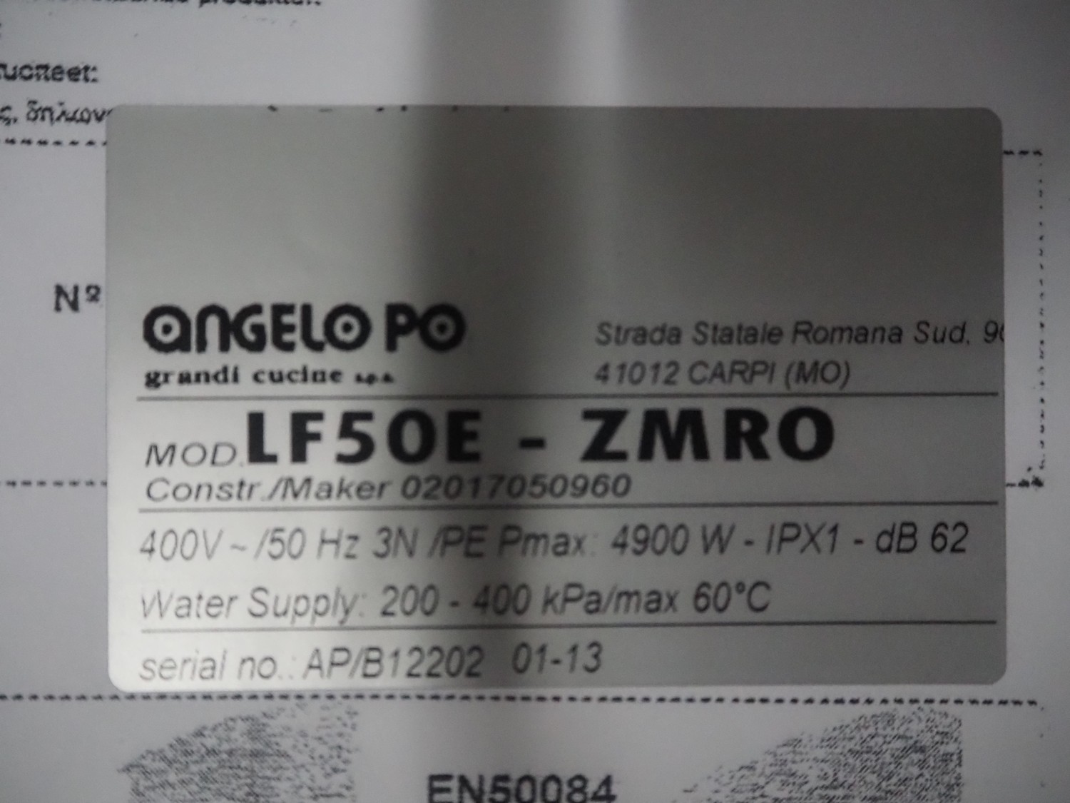 Angelo PO dishwasher, type: LF50E-ZMRO, serial number: AP/B12202, year of construction: 01-13, 400 V, 3 Ph, 50 Hz, 4900 W, inside dimensions: 500 mm x 500 mm, total dimensions: 630 mm x 580 mm x 860 mm.