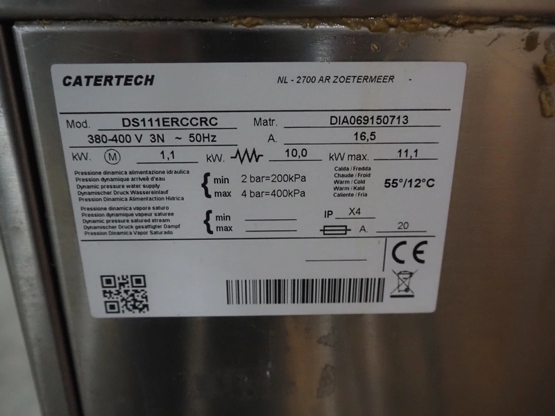Catertech dishwasher, model: DS111ERCCRC, 380-400 V, 3 Ph, 50 Hz, 16.5 A, 11.1 kW, dimensions: 820 mm x 730 mm x 2280 mm.