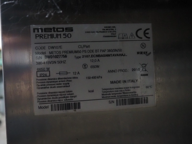 Metos dishwasher, model: METOS PREMIUM50 PS DDE BT PAP, serial number: DWD1027756, year of construction: 2010, 380-415 V, 3 Ph, 50 Hz, 12 A, 6650 W, dimensions: 650 mm x 600 mm x 1370 mm.